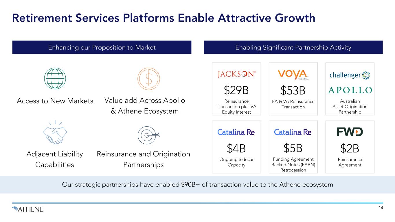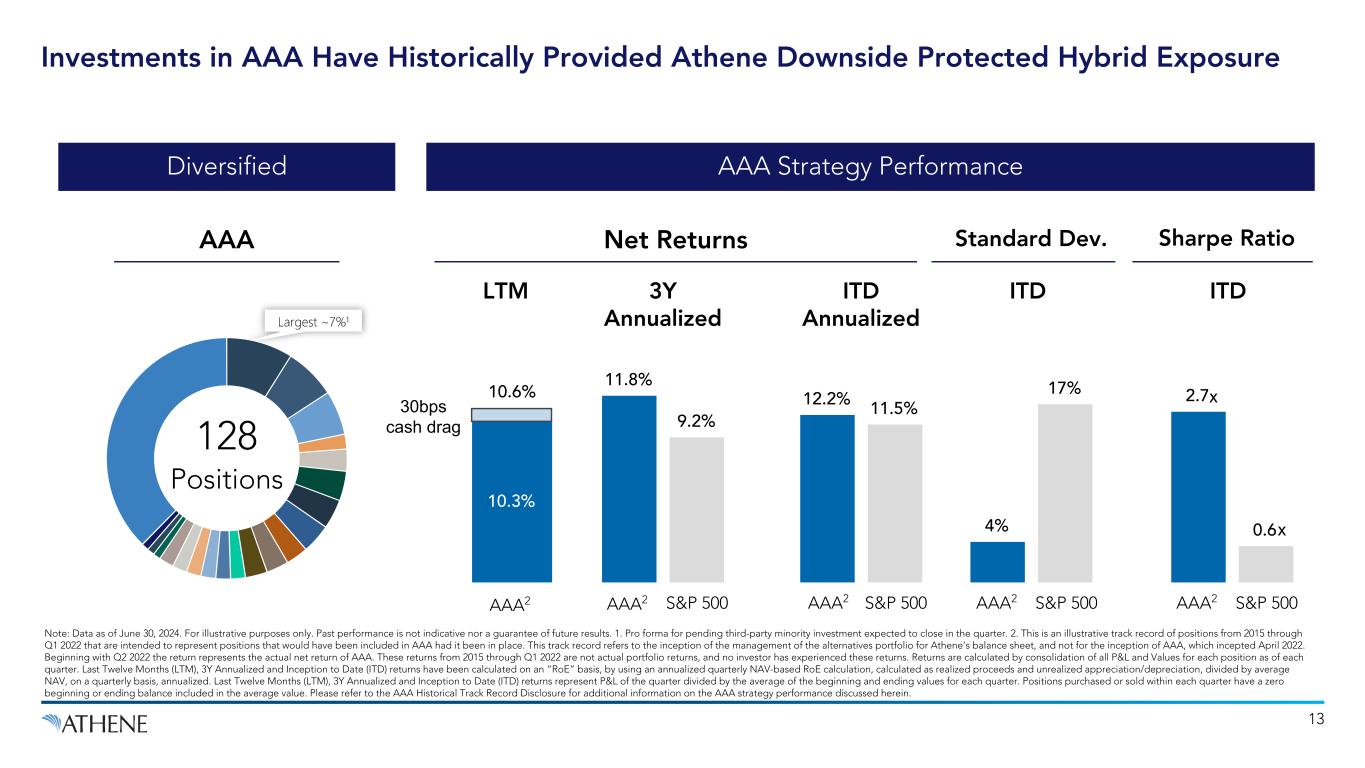 Sharpe RatioStandard Dev. 11.8% 9.2% 30bps cash drag 12.2% 11.5% 4% 17% 2.7 0.6 10.3% 128 Positions Investments in AAA Have Historically Provided Athene Downside Protected Hybrid Exposure AAA Strategy Performance AAA2 S&P 500 Net Returns Note: Data as of June 30, 2024. For illustrative purposes only. Past performance is not indicative nor a guarantee of future results. 1. Pro forma for pending third-party minority investment expected to close in the quarter. 2. This is an illustrative track record of positions from 2015 through Q1 2022 that are intended to represent positions that would have been included in AAA had it been in place. This track record refers to the inception of the management of the alternatives portfolio for Athene’s balance sheet, and not for the inception of AAA, which incepted April 2022. Beginning with Q2 2022 the return represents the actual net return of AAA. These returns from 2015 through Q1 2022 are not actual portfolio returns, and no investor has experienced these returns. Returns are calculated by consolidation of all P&L and Values for each position as of each quarter. Last Twelve Months (LTM), 3Y Annualized and Inception to Date (ITD) returns have been calculated on an “RoE” basis, by using an annualized quarterly NAV-based RoE calculation, calculated as realized proceeds and unrealized appreciation/depreciation, divided by average NAV, on a quarterly basis, annualized. Last Twelve Months (LTM), 3Y Annualized and Inception to Date (ITD) returns represent P&L of the quarter divided by the average of the beginning and ending values for each quarter. Positions purchased or sold within each quarter have a zero beginning or ending balance included in the average value. Please refer to the AAA Historical Track Record Disclosure for additional information on the AAA strategy performance discussed herein. 13 Diversified AAA AAA2 3Y Annualized LTM 10.6% ITD Annualized AAA2 S&P 500 ITD ITD AAA2 S&P 500 AAA2 S&P 500 x x