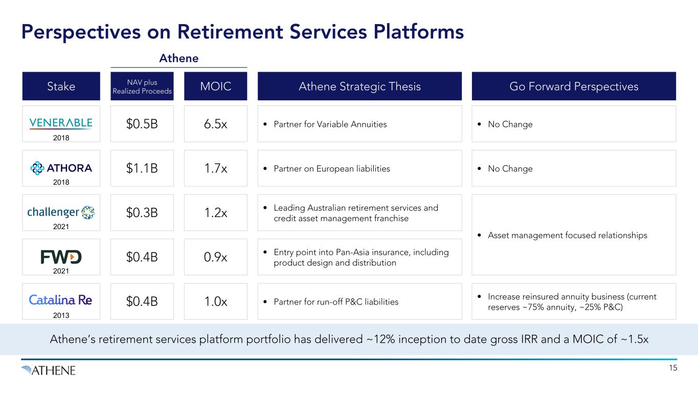 Retirement Services Platforms Enable Attractive Growth Our strategic partnerships have enabled $90B+ of transaction value to the Athene ecosystem $29B Reinsurance Transaction plus VA Equity Interest Australian Asset Origination Partnership $53B FA & VA Reinsurance Transaction $5B Funding Agreement Backed Notes (FABN) Retrocession $2B Reinsurance Agreement $4B Ongoing Sidecar Capacity 14 Enhancing our Proposition to Market Enabling Significant Partnership Activity Adjacent Liability Capabilities Value add Across Apollo & Athene Ecosystem Reinsurance and Origination Partnerships Access to New Markets