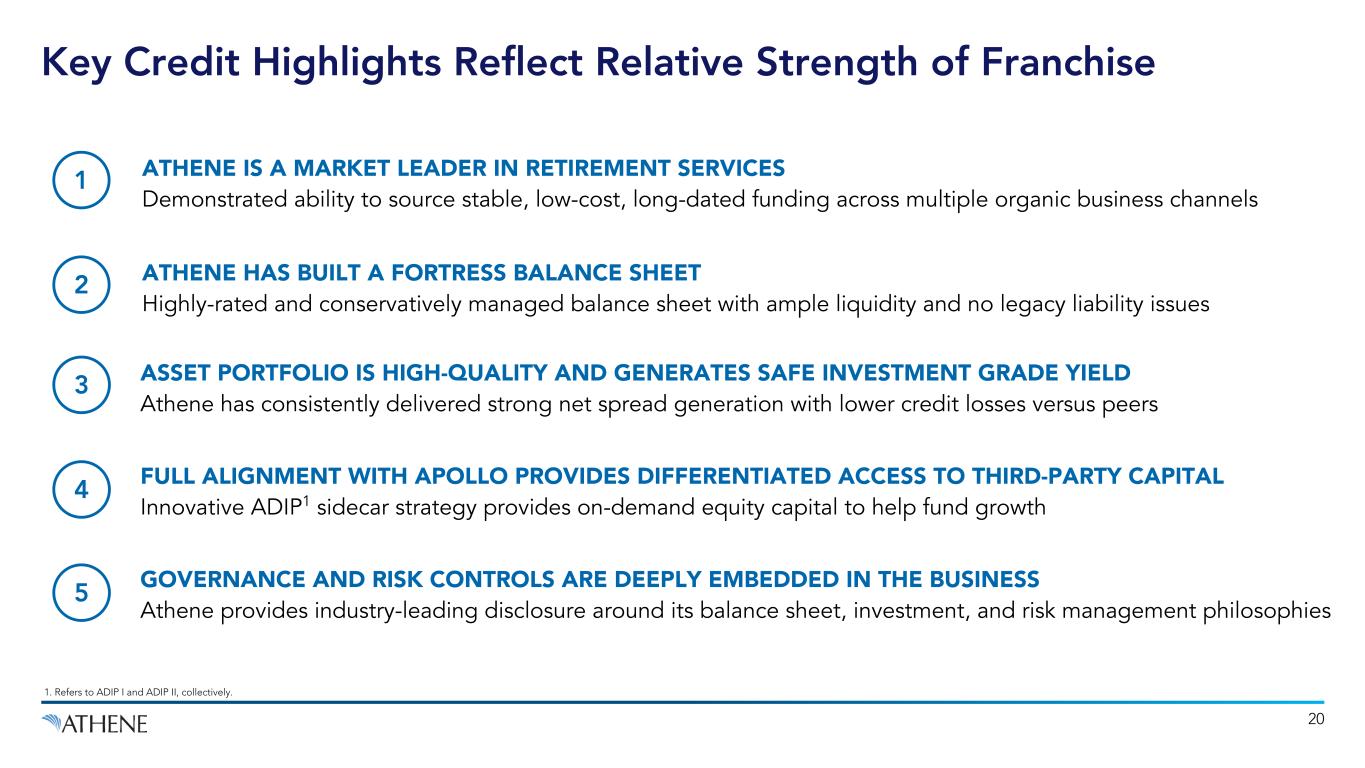 20 Key Credit Highlights Reflect Relative Strength of Franchise ASSET PORTFOLIO IS HIGH-QUALITY AND GENERATES SAFE INVESTMENT GRADE YIELD Athene has consistently delivered strong net spread generation with lower credit losses versus peers 3 ATHENE HAS BUILT A FORTRESS BALANCE SHEET Highly-rated and conservatively managed balance sheet with ample liquidity and no legacy liability issues 2 5 ATHENE IS A MARKET LEADER IN RETIREMENT SERVICES Demonstrated ability to source stable, low-cost, long-dated funding across multiple organic business channels 1 FULL ALIGNMENT WITH APOLLO PROVIDES DIFFERENTIATED ACCESS TO THIRD-PARTY CAPITAL Innovative ADIP1 sidecar strategy provides on-demand equity capital to help fund growth 4 GOVERNANCE AND RISK CONTROLS ARE DEEPLY EMBEDDED IN THE BUSINESS Athene provides industry-leading disclosure around its balance sheet, investment, and risk management philosophies 1. Refers to ADIP I and ADIP II, collectively.