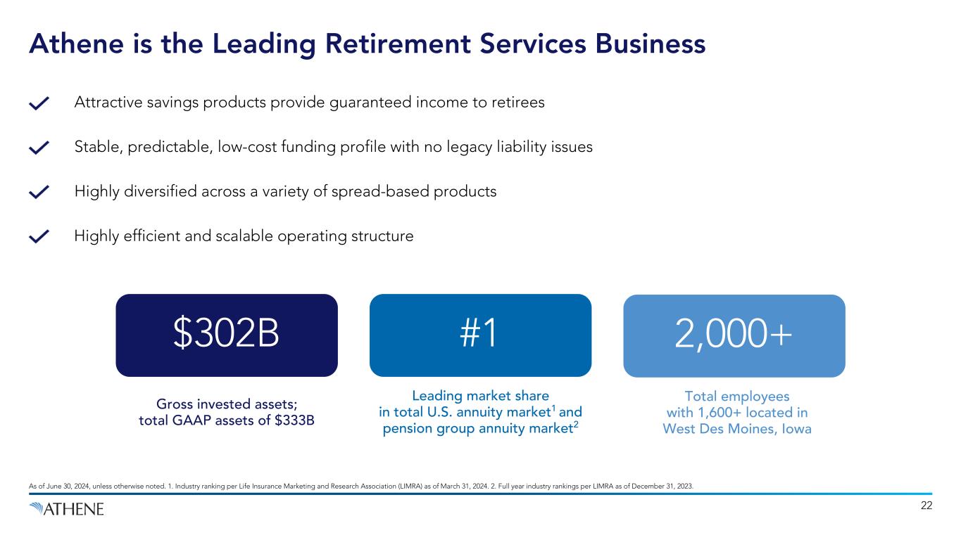 21 Athene has a Distinct Credit Profile Within Apollo $696 billion Assets Under Management ~$29 billion Regulatory Capital2 A+ from S&P, Fitch, AM Best; A1 from Moody’s3 ASSET MANAGEMENT RETIREMENT SERVICES 5,000+ Employees Globally Solutions across the alternative risk spectrum Separate capital structure which issues senior debt, subordinated debt and preferred stock Separate SEC filer with dedicated annual and quarterly disclosure via IR website: CLICK HERE Separate Board of Directors with conflicts committee and a majority of Independent Directors Continuity of established, tenured management A / A from S&P, Fitch; A2 from Moody’s As of June 30, 2024, unless otherwise noted. Please refer to the appendix of this presentation for the definition of Assets Under Management. 1. As of July 26, 2024. 2. Represents the aggregate capital of Athene's US and Bermuda insurance entities, determined with respect to each insurance entity by applying the statutory accounting principles applicable to each such entity. Adjustments are made to, among other things, assets and expenses at the holding company level. Includes capital from noncontrolling interests. 3. Financial strength ratings for primary insurance subsidiaries. Financial strength ratings are statements of opinions and not statements of facts or recommendations to purchase, hold or sell securities. They do not address the suitability of securities for investment purposes and should not be relied on as investment advice. $70 billion Market Capitalization1