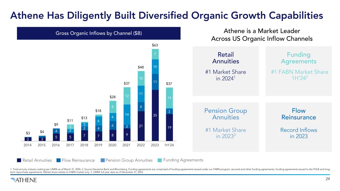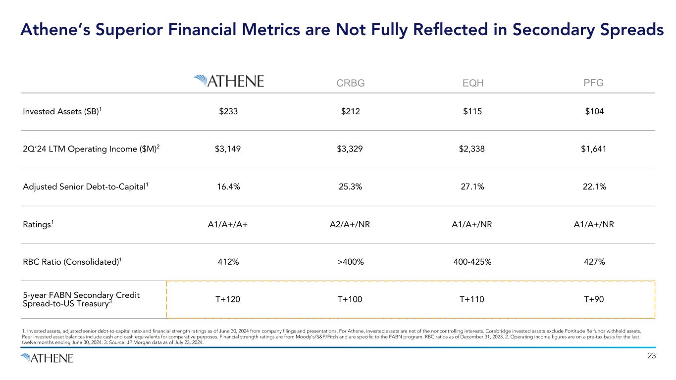 Invested Assets ($B)1 $233 $212 $115 $104 2Q’24 LTM Operating Income ($M)2 $3,149 $3,329 $2,338 $1,641 Adjusted Senior Debt-to-Capital1 16.4% 25.3% 27.1% 22.1% Ratings1 A1/A+/A+ A2/A+/NR A1/A+/NR A1/A+/NR RBC Ratio (Consolidated)1 412% >400% 400-425% 427% 5-year FABN Secondary Credit Spread-to-US Treasury3 T+120 T+100 T+110 T+90 1. Invested assets, adjusted senior debt-to-capital ratio and financial strength ratings as of June 30, 2024 from company filings and presentations. For Athene, invested assets are net of the noncontrolling interests. Corebridge invested assets exclude Fortitude Re funds withheld assets. Peer invested asset balances include cash and cash equivalents for comparative purposes. Financial strength ratings are from Moody’s/S&P/Fitch and are specific to the FABN program. RBC ratios as of December 31, 2023. 2. Operating income figures are on a pre-tax basis for the last twelve months ending June 30, 2024. 3. Source: JP Morgan data as of July 23, 2024. 23 CRBG EQH PFG Athene’s Superior Financial Metrics are Not Fully Reflected in Secondary Spreads