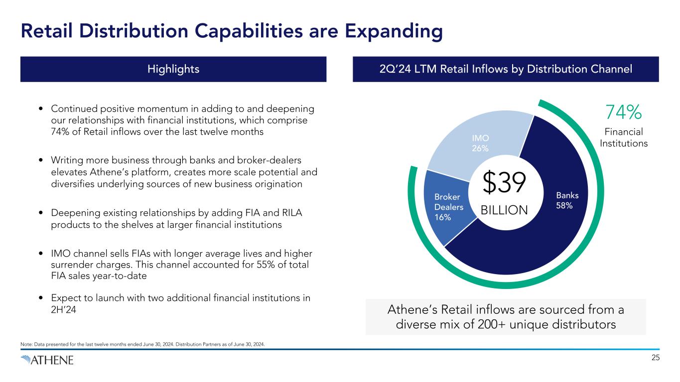 1. Total annuity industry ranking per LIMRA as of March 31, 2024. 2. Source Deutsche Bank and Bloomberg. Funding agreements are comprised of funding agreements issued under our FABN program, secured and other funding agreements, funding agreements issued to the FHLB and long- term repurchase agreements. Market share relates to FABN market only. 3. LIMRA full year data as of December 31, 2023. $3 $4 $9 $11 $13 $18 $28 $37 $48 $63 $37 3 3 5 5 7 7 8 9 21 35 19 4 2 4 6 2 6 11 3 2 3 6 6 14 11 10 3 8 12 10 7 14 2014 2015 2016 2017 2018 2019 2020 2021 2022 2023 1H’24 24 Athene Has Diligently Built Diversified Organic Growth Capabilities Funding AgreementsRetail Annuities Flow Reinsurance Pension Group Annuities Athene is a Market Leader Across US Organic Inflow Channels Pension Group Annuities #1 Market Share in 20233 Funding Agreements #1 FABN Market Share 1H’242 Retail Annuities #1 Market Share in 20241 Flow Reinsurance Record Inflows in 2023 Gross Organic Inflows by Channel ($B)