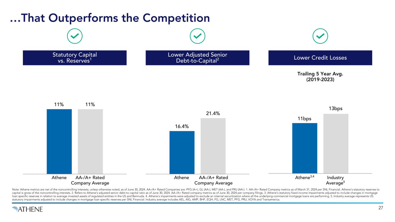 26 Note: Athene metrics are net of the noncontrolling interests, as of June 30, 2024. 1. Relates to Athene’s primary insurance subsidiaries; represents ratings from AM Best "A+", Fitch "A+", S&P "A+" and Moody’s "A1". 2. Represents the aggregate capital of Athene's US and Bermuda insurance entities, determined with respect to each insurance entity by applying the statutory accounting principles applicable to each such entity. Adjustments are made to, among other things, assets and expenses at the holding company level. Includes capital from noncontrolling interests. 3. Computed as capital in excess of the capital required to support our core operating strategies, as determined based upon internal modeling and analysis of economic risk, as well as inputs from rating agency capital models and consideration of both NAIC RBC and Bermuda capital requirements. 4. Includes $8.2 billion of cash and cash equivalents, $2.6 billion AHL/Athene Life Re Ltd. (ALRe) liquidity facility with $0.5 billion accordion feature, $1.25 billion AHL credit facility with $0.5 billion accordion feature, $2.0 billion committed repos, $1.7 billion of FHLB capacity, and $48.6 billion liquid asset portfolio. Availability of accordion features subject to lender consent and other factors. 5. Includes $3.0 billion in excess equity capital, $3.3 billion in untapped leverage capacity and $3.8 billion in available undrawn capital at ACRA. Untapped leverage capacity assumes an adjusted leverage ratio of not more than 30%, subject to maintaining a sufficient level of capital required to maintain our desired financial strength ratings from rating agencies. Athene Has Built a Fortress Balance Sheet… Financial Strength Profile A+ $3.0B Excess Equity Capital3 $29B Regulatory Capital2 $10.1B Total Deployable Capital5 Available Liquidity $65B 41