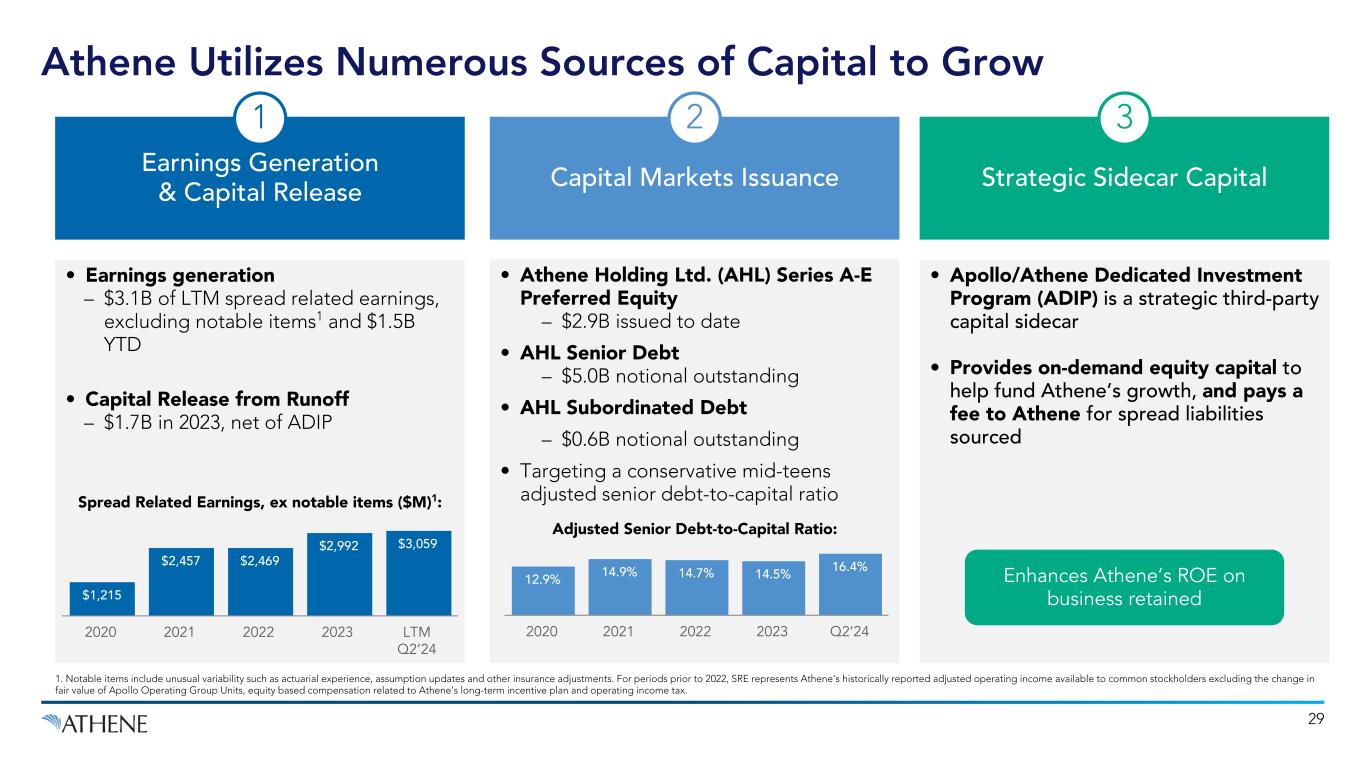 28 Strong Capital and Liquidity Profile Note: Athene metrics are net of the noncontrolling interests, as of June 30, 2024, unless otherwise noted. 1. The consolidated risk-based capital ratio of our non-US reinsurance and US insurance subsidiaries is calculated by applying NAIC risk-based capital factors to the statutory financial statements on an aggregate basis, including interests in other non-insurance subsidiary holding companies; with an adjustment in Bermuda and non-insurance holding companies to limit RBC concentration charges such that when they are applied to determine target capital, the charges do not exceed 100% of the asset’s carrying value. 2. The CAL RBC ratio for Athene Annuity & Life Assurance Company, our parent US insurance company. 3. The risk-based capital ratio of our non-US reinsurance subsidiaries is calculated by applying NAIC risk-based capital factors to the statutory financial statements on an aggregate basis, excluding US subsidiaries and interests in other non-insurance subsidiary holding companies with an adjustment in Bermuda and non-insurance holding companies to limit RBC concentration charges such that when they are applied to determine target capital, the charges do not exceed 100% of the asset’s carrying value. 4. Relates to the $2.6 billion liquidity facility, with $0.5 billion accordion feature available to AHL and ALRe and the $1.25 billion credit facility, with $0.5 billion accordion feature available to AHL. Availability of accordion features subject to lender consent and other factors. 5. Relates to $1.7 billion of available FHLB borrowing capacity. 6. Includes investment grade market value of $43.6 billion of public corporate bonds, $2.7 billion of US Government and Agencies, $1.4 billion of State and Municipal bonds, and $0.9 billion Agency RMBS; excludes pledged assets, mainly associated with funding agreement and repurchase agreement liabilities, but includes assets held in reinsurance trusts. The value was updated in the current quarter from book value to market value, as well as to remove bank loans, emerging markets, and preferred stock and to add agency RMBS. 412% 2023 Consolidated RBC Ratio1 392% 2023 U.S. RBC Ratio2 400% 2023 Bermuda RBC Ratio3 Athene’s Available Liquidity ($B) $65.4 Liquid Assets6 5 48.6 Cash & Cash Equivalents1 $8.2 Committed Repurchase Facilities3 2.0 Credit Facilities42 4.9 Other Liquidity54 1.7 Total Available Liquidity