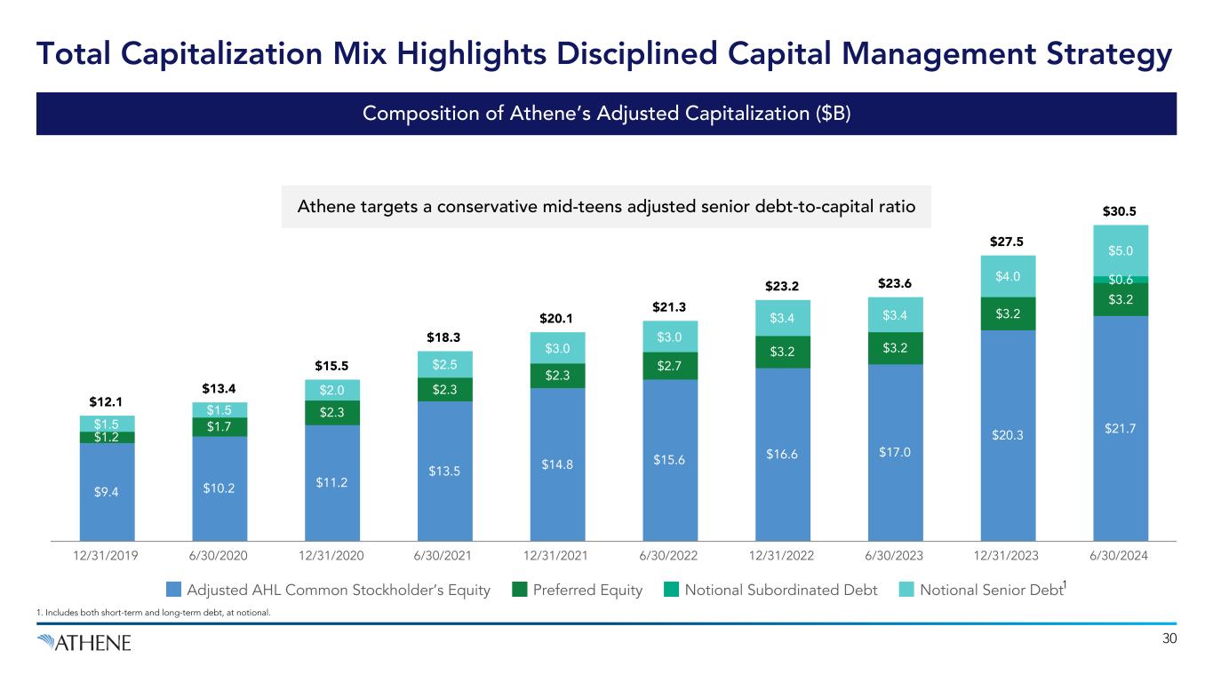 • Athene Holding Ltd. (AHL) Series A-E Preferred Equity – $2.9B issued to date • AHL Senior Debt – $5.0B notional outstanding • AHL Subordinated Debt – $0.6B notional outstanding • Targeting a conservative mid-teens adjusted senior debt-to-capital ratio 12.9% 14.9% 14.7% 14.5% 16.4% 2020 2021 2022 2023 Q2’24 • Earnings generation – $3.1B of LTM spread related earnings, excluding notable items1 and $1.5B YTD • Capital Release from Runoff – $1.7B in 2023, net of ADIP $1,215 $2,457 $2,469 $2,992 $3,059 2020 2021 2022 2023 LTM Q2’24 29 Athene Utilizes Numerous Sources of Capital to Grow Earnings Generation & Capital Release 1 Capital Markets Issuance 2 • Apollo/Athene Dedicated Investment Program (ADIP) is a strategic third-party capital sidecar • Provides on-demand equity capital to help fund Athene’s growth, and pays a fee to Athene for spread liabilities sourced Strategic Sidecar Capital 3 Adjusted Senior Debt-to-Capital Ratio: Spread Related Earnings, ex notable items ($M)1: Enhances Athene’s ROE on business retained 1. Notable items include unusual variability such as actuarial experience, assumption updates and other insurance adjustments. For periods prior to 2022, SRE represents Athene’s historically reported adjusted operating income available to common stockholders excluding the change in fair value of Apollo Operating Group Units, equity based compensation related to Athene’s long-term incentive plan and operating income tax.