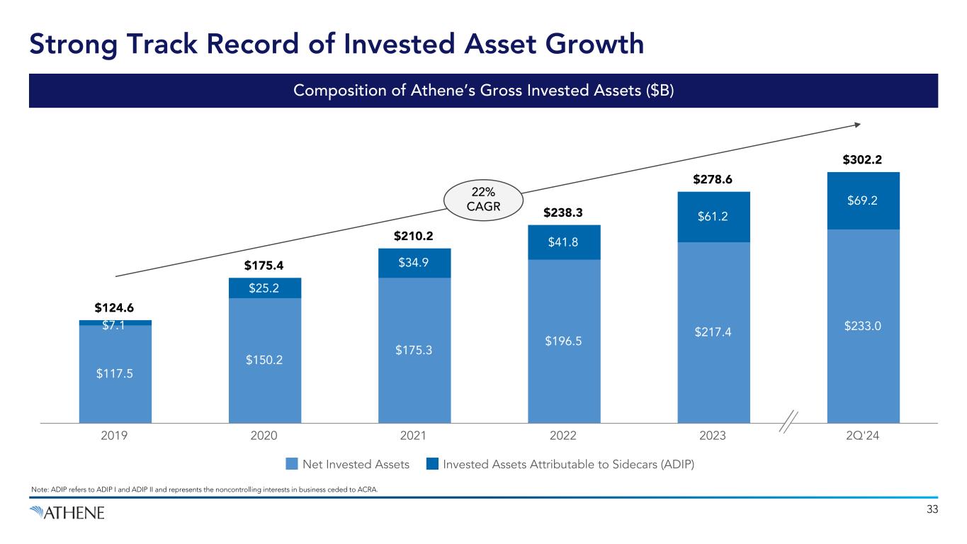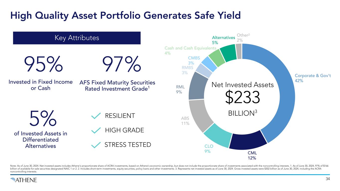 $124.6 $175.4 $210.2 $238.3 $278.6 $302.2 $117.5 $150.2 $175.3 $196.5 $217.4 $233.0 $25.2 $34.9 $41.8 $61.2 $69.2 Net Invested Assets Invested Assets Attributable to Sidecars (ADIP) 2019 2020 2021 2022 2023 2Q'24 33 Strong Track Record of Invested Asset Growth 22% CAGR Composition of Athene’s Gross Invested Assets ($B) Note: ADIP refers to ADIP I and ADIP II and represents the noncontrolling interests in business ceded to ACRA. $7.1