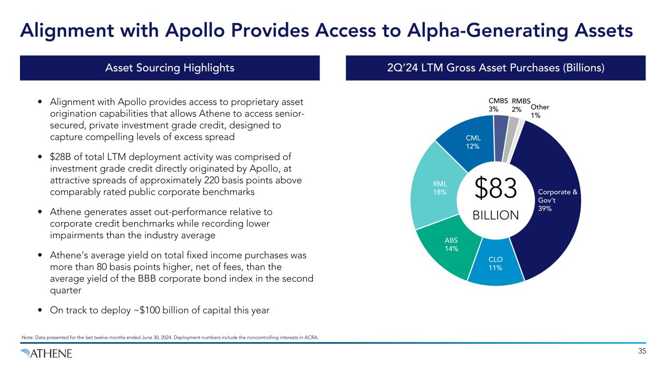 Corporate & Gov’t 42% CML 12% CLO 9% ABS 11% RML 9% RMBS 3% CMBS 3% Cash and Cash Equivalents 4% Alternatives 5% Other 2% Net Invested Assets $233 BILLION3 Note: As of June 30, 2024. Net invested assets includes Athene's proportionate share of ACRA investments, based on Athene's economic ownership, but does not include the proportionate share of investments associated with the noncontrolling interests. 1. As of June 30, 2024, 97% of $166 billion of available-for-sale securities designated NAIC 1 or 2. 2. Includes short-term investments, equity securities, policy loans and other investments. 3. Represents net invested assets as of June 30, 2024. Gross invested assets were $302 billion as of June 30, 2024, including the ACRA noncontrolling interests. High Quality Asset Portfolio Generates Safe Yield AFS Fixed Maturity Securities Rated Investment Grade1 RESILIENT HIGH GRADE STRESS TESTED 97% Invested in Fixed Income or Cash 95% of Invested Assets in Differentiated Alternatives 5% 34 Key Attributes 2