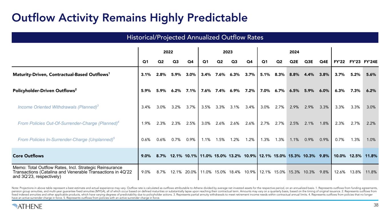 Historical/Projected Annualized Outflow Rates 38 Note: Projections in above table represent a best estimate and actual experience may vary. Outflow rate is calculated as outflows attributable to Athene divided by average net invested assets for the respective period, on an annualized basis. 1. Represents outflows from funding agreements, pension group annuities, and multi-year guarantee fixed annuities (MYGA), all of which occur based on defined maturities or substantially lapse upon reaching their contractual term. Amounts may vary on a quarterly basis, based on the timing of original issuance. 2. Represents outflows from fixed indexed annuities and other applicable products, which have varying degrees of predictability due to policyholder actions. 3. Represents partial annuity withdrawals to meet retirement income needs within contractual annual limits. 4. Represents outflows from policies that no longer have an active surrender charge in force. 5. Represents outflows from policies with an active surrender charge in force. 2022 2023 2024 Q1 Q2 Q3 Q4 Q1 Q2 Q3 Q4 Q1 Q2 Q2E Q3E Q4E FY’22 FY’23 FY’24E Maturity-Driven, Contractual-Based Outflows1 3.1% 2.8% 5.9% 3.0% 3.4% 7.6% 6.3% 3.7% 5.1% 8.3% 8.8% 4.4% 3.8% 3.7% 5.2% 5.6% Policyholder-Driven Outflows2 5.9% 5.9% 6.2% 7.1% 7.6% 7.4% 6.9% 7.2% 7.0% 6.7% 6.5% 5.9% 6.0% 6.3% 7.3% 6.2% Income Oriented Withdrawals (Planned)3 3.4% 3.0% 3.2% 3.7% 3.5% 3.3% 3.1% 3.4% 3.0% 2.7% 2.9% 2.9% 3.3% 3.3% 3.3% 3.0% From Policies Out-Of-Surrender-Charge (Planned)4 1.9% 2.3% 2.3% 2.5% 3.0% 2.6% 2.6% 2.6% 2.7% 2.7% 2.5% 2.1% 1.8% 2.3% 2.7% 2.2% From Policies In-Surrender-Charge (Unplanned)5 0.6% 0.6% 0.7% 0.9% 1.1% 1.5% 1.2% 1.2% 1.3% 1.3% 1.1% 0.9% 0.9% 0.7% 1.3% 1.0% Core Outflows 9.0% 8.7% 12.1% 10.1% 11.0% 15.0% 13.2% 10.9% 12.1% 15.0% 15.3% 10.3% 9.8% 10.0% 12.5% 11.8% Memo: Total Outflow Rates, Incl. Strategic Reinsurance Transactions (Catalina and Venerable Transactions in 4Q’22 and 3Q’23, respectively) 9.0% 8.7% 12.1% 20.0% 11.0% 15.0% 18.4% 10.9% 12.1% 15.0% 15.3% 10.3% 9.8% 12.6% 13.8% 11.8% Outflow Activity Remains Highly Predictable