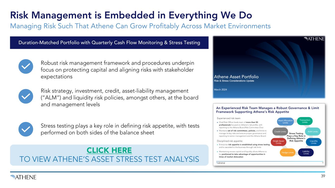 39 Robust risk management framework and procedures underpin focus on protecting capital and aligning risks with stakeholder expectations Risk strategy, investment, credit, asset-liability management (“ALM”) and liquidity risk policies, amongst others, at the board and management levels Stress testing plays a key role in defining risk appetite, with tests performed on both sides of the balance sheet Risk Management is Embedded in Everything We Do Managing Risk Such That Athene Can Grow Profitably Across Market Environments CLICK HERE TO VIEW ATHENE’S ASSET STRESS TEST ANALYSIS Duration-Matched Portfolio with Quarterly Cash Flow Monitoring & Stress Testing