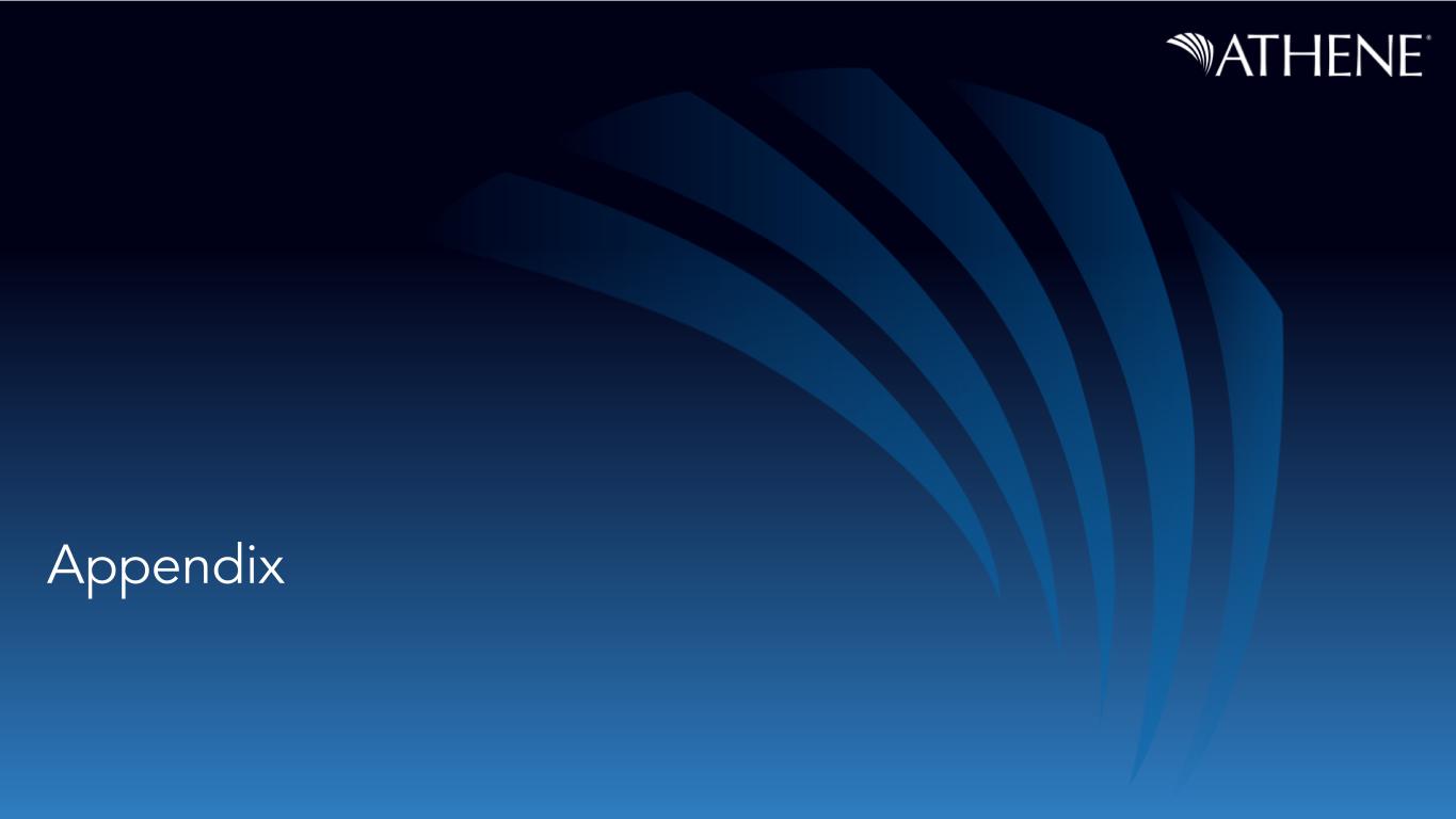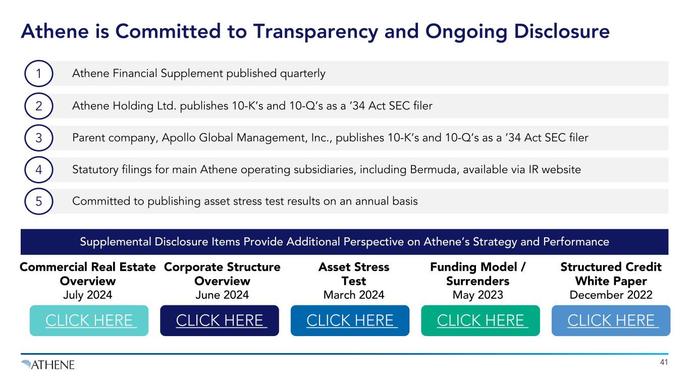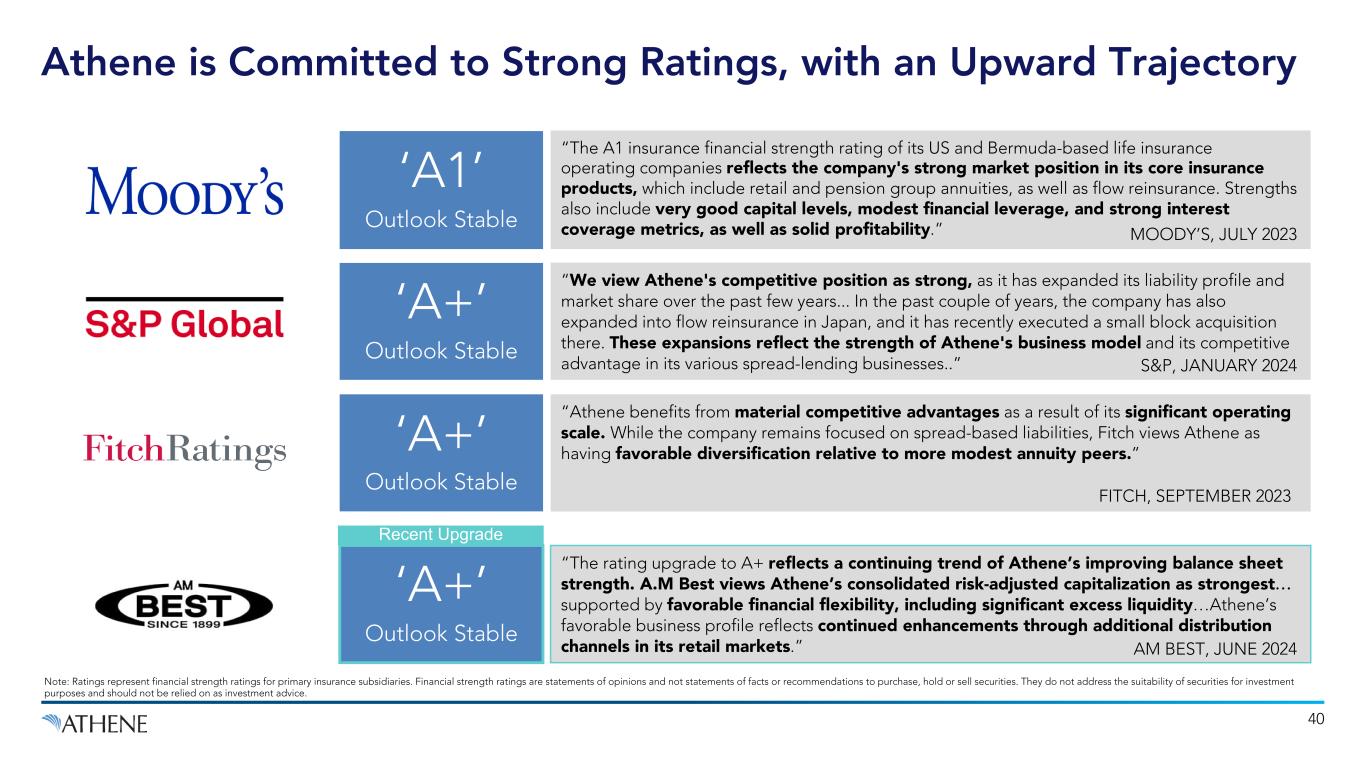 “The rating upgrade to A+ reflects a continuing trend of Athene’s improving balance sheet strength. A.M Best views Athene’s consolidated risk-adjusted capitalization as strongest… supported by favorable financial flexibility, including significant excess liquidity…Athene’s favorable business profile reflects continued enhancements through additional distribution channels in its retail markets.” “The A1 insurance financial strength rating of its US and Bermuda-based life insurance operating companies reflects the company's strong market position in its core insurance products, which include retail and pension group annuities, as well as flow reinsurance. Strengths also include very good capital levels, modest financial leverage, and strong interest coverage metrics, as well as solid profitability.” ‘A1’ Outlook Stable 40 ‘A+’ Outlook Stable “Athene benefits from material competitive advantages as a result of its significant operating scale. While the company remains focused on spread-based liabilities, Fitch views Athene as having favorable diversification relative to more modest annuity peers.” “We view Athene's competitive position as strong, as it has expanded its liability profile and market share over the past few years... In the past couple of years, the company has also expanded into flow reinsurance in Japan, and it has recently executed a small block acquisition there. These expansions reflect the strength of Athene's business model and its competitive advantage in its various spread-lending businesses..” ‘A+’ Outlook Stable ‘A+’ Outlook Stable S&P, JANUARY 2024 FITCH, SEPTEMBER 2023 AM BEST, JUNE 2024 MOODY’S, JULY 2023 Note: Ratings represent financial strength ratings for primary insurance subsidiaries. Financial strength ratings are statements of opinions and not statements of facts or recommendations to purchase, hold or sell securities. They do not address the suitability of securities for investment purposes and should not be relied on as investment advice. Athene is Committed to Strong Ratings, with an Upward Trajectory Recent Upgrade