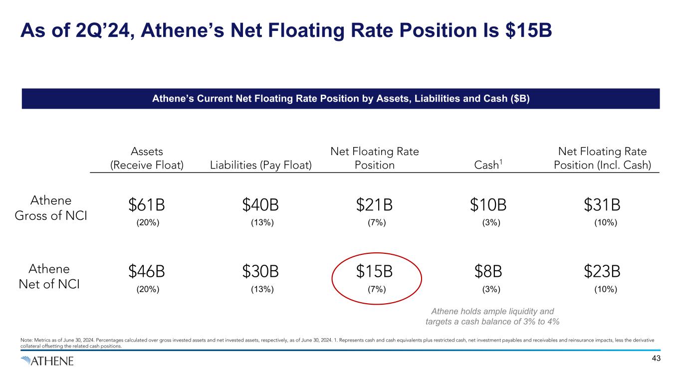 As of 2Q’24, Athene’s Net Floating Rate Position Is $15B 43 Athene’s Current Net Floating Rate Position by Assets, Liabilities and Cash ($B) Note: Metrics as of June 30, 2024. Percentages calculated over gross invested assets and net invested assets, respectively, as of June 30, 2024. 1. Represents cash and cash equivalents plus restricted cash, net investment payables and receivables and reinsurance impacts, less the derivative collateral offsetting the related cash positions. Assets (Receive Float) Liabilities (Pay Float) Net Floating Rate Position Cash1 Net Floating Rate Position (Incl. Cash) $61B $40B $21B $10B $31B $46B $30B $15B $8B $23B (20%) (13%) (7%) (3%) (10%) (20%) (13%) (7%) (3%) (10%) Athene Gross of NCI Athene Net of NCI Athene holds ample liquidity and targets a cash balance of 3% to 4%