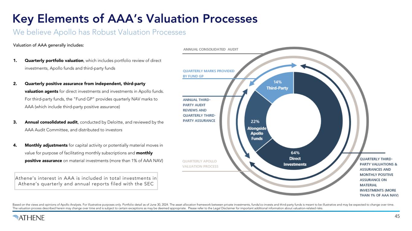 Key Elements of AAA’s Valuation Processes Based on the views and opinions of Apollo Analysts. For illustrative purposes only. Portfolio detail as of June 30, 2024. The asset allocation framework between private investments, funds/co-invests and third-party funds is meant to be illustrative and may be expected to change over time. The valuation process described herein may change over time and is subject to certain exceptions as may be deemed appropriate. Please refer to the Legal Disclaimer for important additional information about valuation-related risks. Valuation of AAA generally includes: 1. Quarterly portfolio valuation, which includes portfolio review of direct investments, Apollo funds and third-party funds 2. Quarterly positive assurance from independent, third-party valuation agents for direct investments and investments in Apollo funds. For third-party funds, the "Fund GP" provides quarterly NAV marks to AAA (which include third-party positive assurance) 3. Annual consolidated audit, conducted by Deloitte, and reviewed by the AAA Audit Committee, and distributed to investors 4. Monthly adjustments for capital activity or potentially material moves in value for purpose of facilitating monthly subscriptions and monthly positive assurance on material investments (more than 1% of AAA NAV) Athene’s interest in AAA is included in total investments in Athene’s quarterly and annual reports filed with the SEC 45 We believe Apollo has Robust Valuation Processes