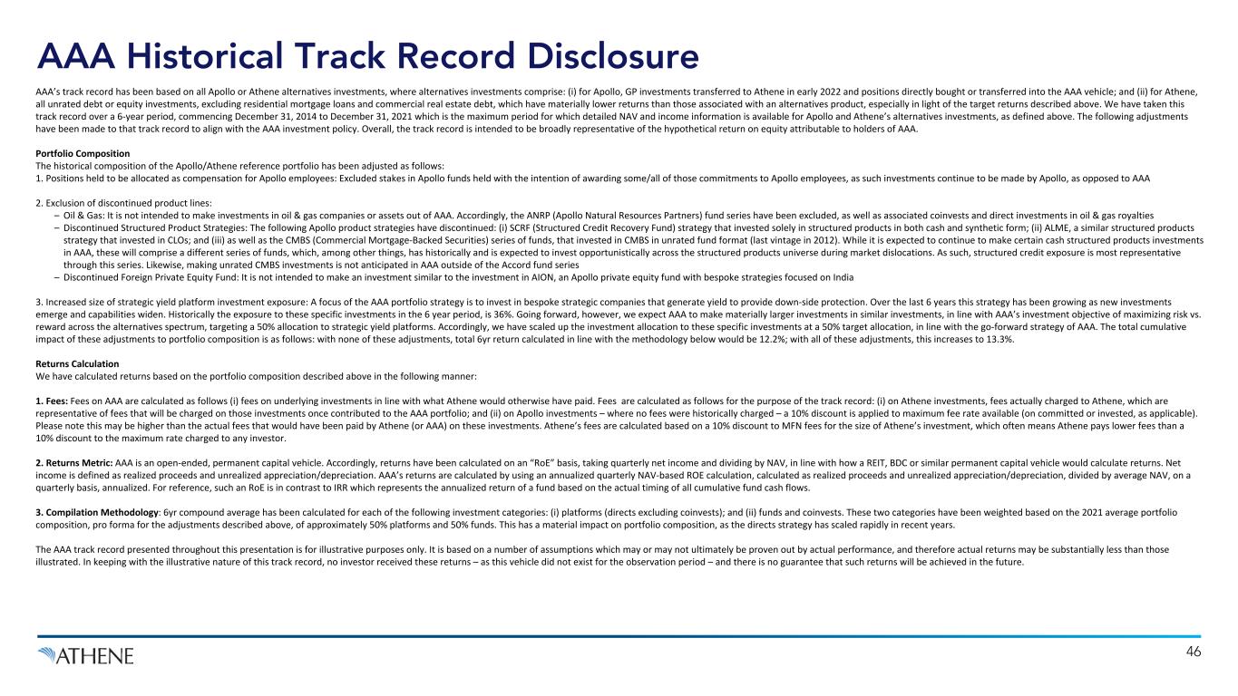 AAA Historical Track Record Disclosure AAA’s track record has been based on all Apollo or Athene alternatives investments, where alternatives investments comprise: (i) for Apollo, GP investments transferred to Athene in early 2022 and positions directly bought or transferred into the AAA vehicle; and (ii) for Athene, all unrated debt or equity investments, excluding residential mortgage loans and commercial real estate debt, which have materially lower returns than those associated with an alternatives product, especially in light of the target returns described above. We have taken this track record over a 6-year period, commencing December 31, 2014 to December 31, 2021 which is the maximum period for which detailed NAV and income information is available for Apollo and Athene’s alternatives investments, as defined above. The following adjustments have been made to that track record to align with the AAA investment policy. Overall, the track record is intended to be broadly representative of the hypothetical return on equity attributable to holders of AAA. Portfolio Composition The historical composition of the Apollo/Athene reference portfolio has been adjusted as follows: 1. Positions held to be allocated as compensation for Apollo employees: Excluded stakes in Apollo funds held with the intention of awarding some/all of those commitments to Apollo employees, as such investments continue to be made by Apollo, as opposed to AAA 2. Exclusion of discontinued product lines: – Oil & Gas: It is not intended to make investments in oil & gas companies or assets out of AAA. Accordingly, the ANRP (Apollo Natural Resources Partners) fund series have been excluded, as well as associated coinvests and direct investments in oil & gas royalties – Discontinued Structured Product Strategies: The following Apollo product strategies have discontinued: (i) SCRF (Structured Credit Recovery Fund) strategy that invested solely in structured products in both cash and synthetic form; (ii) ALME, a similar structured products strategy that invested in CLOs; and (iii) as well as the CMBS (Commercial Mortgage-Backed Securities) series of funds, that invested in CMBS in unrated fund format (last vintage in 2012). While it is expected to continue to make certain cash structured products investments in AAA, these will comprise a different series of funds, which, among other things, has historically and is expected to invest opportunistically across the structured products universe during market dislocations. As such, structured credit exposure is most representative through this series. Likewise, making unrated CMBS investments is not anticipated in AAA outside of the Accord fund series – Discontinued Foreign Private Equity Fund: It is not intended to make an investment similar to the investment in AION, an Apollo private equity fund with bespoke strategies focused on India 3. Increased size of strategic yield platform investment exposure: A focus of the AAA portfolio strategy is to invest in bespoke strategic companies that generate yield to provide down-side protection. Over the last 6 years this strategy has been growing as new investments emerge and capabilities widen. Historically the exposure to these specific investments in the 6 year period, is 36%. Going forward, however, we expect AAA to make materially larger investments in similar investments, in line with AAA’s investment objective of maximizing risk vs. reward across the alternatives spectrum, targeting a 50% allocation to strategic yield platforms. Accordingly, we have scaled up the investment allocation to these specific investments at a 50% target allocation, in line with the go-forward strategy of AAA. The total cumulative impact of these adjustments to portfolio composition is as follows: with none of these adjustments, total 6yr return calculated in line with the methodology below would be 12.2%; with all of these adjustments, this increases to 13.3%. Returns Calculation We have calculated returns based on the portfolio composition described above in the following manner: 1. Fees: Fees on AAA are calculated as follows (i) fees on underlying investments in line with what Athene would otherwise have paid. Fees are calculated as follows for the purpose of the track record: (i) on Athene investments, fees actually charged to Athene, which are representative of fees that will be charged on those investments once contributed to the AAA portfolio; and (ii) on Apollo investments – where no fees were historically charged – a 10% discount is applied to maximum fee rate available (on committed or invested, as applicable). Please note this may be higher than the actual fees that would have been paid by Athene (or AAA) on these investments. Athene’s fees are calculated based on a 10% discount to MFN fees for the size of Athene’s investment, which often means Athene pays lower fees than a 10% discount to the maximum rate charged to any investor. 2. Returns Metric: AAA is an open-ended, permanent capital vehicle. Accordingly, returns have been calculated on an “RoE” basis, taking quarterly net income and dividing by NAV, in line with how a REIT, BDC or similar permanent capital vehicle would calculate returns. Net income is defined as realized proceeds and unrealized appreciation/depreciation. AAA’s returns are calculated by using an annualized quarterly NAV-based ROE calculation, calculated as realized proceeds and unrealized appreciation/depreciation, divided by average NAV, on a quarterly basis, annualized. For reference, such an RoE is in contrast to IRR which represents the annualized return of a fund based on the actual timing of all cumulative fund cash flows. 3. Compilation Methodology: 6yr compound average has been calculated for each of the following investment categories: (i) platforms (directs excluding coinvests); and (ii) funds and coinvests. These two categories have been weighted based on the 2021 average portfolio comp