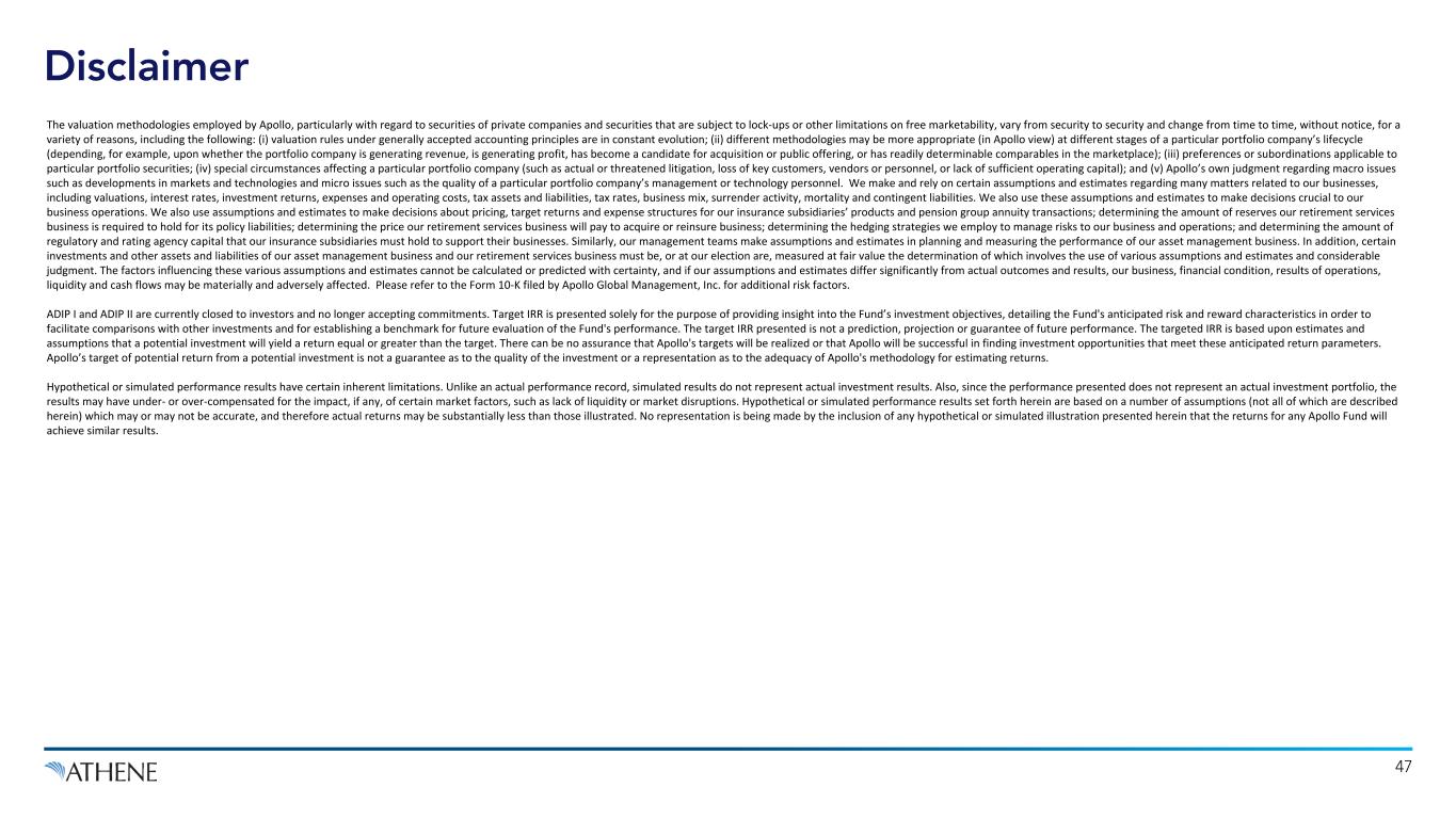 The valuation methodologies employed by Apollo, particularly with regard to securities of private companies and securities that are subject to lock-ups or other limitations on free marketability, vary from security to security and change from time to time, without notice, for a variety of reasons, including the following: (i) valuation rules under generally accepted accounting principles are in constant evolution; (ii) different methodologies may be more appropriate (in Apollo view) at different stages of a particular portfolio company’s lifecycle (depending, for example, upon whether the portfolio company is generating revenue, is generating profit, has become a candidate for acquisition or public offering, or has readily determinable comparables in the marketplace); (iii) preferences or subordinations applicable to particular portfolio securities; (iv) special circumstances affecting a particular portfolio company (such as actual or threatened litigation, loss of key customers, vendors or personnel, or lack of sufficient operating capital); and (v) Apollo’s own judgment regarding macro issues such as developments in markets and technologies and micro issues such as the quality of a particular portfolio company’s management or technology personnel. We make and rely on certain assumptions and estimates regarding many matters related to our businesses, including valuations, interest rates, investment returns, expenses and operating costs, tax assets and liabilities, tax rates, business mix, surrender activity, mortality and contingent liabilities. We also use these assumptions and estimates to make decisions crucial to our business operations. We also use assumptions and estimates to make decisions about pricing, target returns and expense structures for our insurance subsidiaries’ products and pension group annuity transactions; determining the amount of reserves our retirement services business is required to hold for its policy liabilities; determining the price our retirement services business will pay to acquire or reinsure business; determining the hedging strategies we employ to manage risks to our business and operations; and determining the amount of regulatory and rating agency capital that our insurance subsidiaries must hold to support their businesses. Similarly, our management teams make assumptions and estimates in planning and measuring the performance of our asset management business. In addition, certain investments and other assets and liabilities of our asset management business and our retirement services business must be, or at our election are, measured at fair value the determination of which involves the use of various assumptions and estimates and considerable judgment. The factors influencing these various assumptions and estimates cannot be calculated or predicted with certainty, and if our assumptions and estimates differ significantly from actual outcomes and results, our business, financial condition, results of operations, liquidity and cash flows may be materially and adversely affected. Please refer to the Form 10-K filed by Apollo Global Management, Inc. for additional risk factors. ADIP I and ADIP II are currently closed to investors and no longer accepting commitments. Target IRR is presented solely for the purpose of providing insight into the Fund’s investment objectives, detailing the Fund's anticipated risk and reward characteristics in order to facilitate comparisons with other investments and for establishing a benchmark for future evaluation of the Fund's performance. The target IRR presented is not a prediction, projection or guarantee of future performance. The targeted IRR is based upon estimates and assumptions that a potential investment will yield a return equal or greater than the target. There can be no assurance that Apollo's targets will be realized or that Apollo will be successful in finding investment opportunities that meet these anticipated return parameters. Apollo’s target of potential return from a potential investment is not a guarantee as to the quality of the investment or a representation as to the adequacy of Apollo's methodology for estimating returns. Hypothetical or simulated performance results have certain inherent limitations. Unlike an actual performance record, simulated results do not represent actual investment results. Also, since the performance presented does not represent an actual investment portfolio, the results may have under- or over-compensated for the impact, if any, of certain market factors, such as lack of liquidity or market disruptions. Hypothetical or simulated performance results set forth herein are based on a number of assumptions (not all of which are described herein) which may or may not be accurate, and therefore actual returns may be substantially less than those illustrated. No representation is being made by the inclusion of any hypothetical or simulated illustration presented herein that the returns for any Apollo Fund will achieve similar results. Disclaimer 47