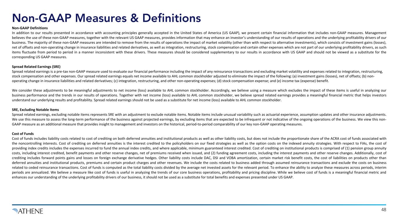 Non-GAAP Definitions In addition to our results presented in accordance with accounting principles generally accepted in the United States of America (US GAAP), we present certain financial information that includes non-GAAP measures. Management believes the use of these non-GAAP measures, together with the relevant US GAAP measures, provides information that may enhance an investor’s understanding of our results of operations and the underlying profitability drivers of our business. The majority of these non-GAAP measures are intended to remove from the results of operations the impact of market volatility (other than with respect to alternative investments), which consists of investment gains (losses), net of offsets and non-operating change in insurance liabilities and related derivatives, as well as integration, restructuring, stock compensation and certain other expenses which are not part of our underlying profitability drivers, as such items fluctuate from period to period in a manner inconsistent with these drivers. These measures should be considered supplementary to our results in accordance with US GAAP and should not be viewed as a substitute for the corresponding US GAAP measures. Spread Related Earnings (SRE) Spread related earnings is a pre-tax non-GAAP measure used to evaluate our financial performance including the impact of any reinsurance transactions and excluding market volatility and expenses related to integration, restructuring, stock compensation and other expenses. Our spread related earnings equals net income available to AHL common stockholder adjusted to eliminate the impact of the following: (a) investment gains (losses), net of offsets; (b) non- operating change in insurance liabilities and related derivatives; (c) integration, restructuring, and other non-operating expenses; (d) stock compensation expense; and (e) income tax (expense) benefit. We consider these adjustments to be meaningful adjustments to net income (loss) available to AHL common stockholder. Accordingly, we believe using a measure which excludes the impact of these items is useful in analyzing our business performance and the trends in our results of operations. Together with net income (loss) available to AHL common stockholder, we believe spread related earnings provides a meaningful financial metric that helps investors understand our underlying results and profitability. Spread related earnings should not be used as a substitute for net income (loss) available to AHL common stockholder. SRE, Excluding Notable Items Spread related earnings, excluding notable items represents SRE with an adjustment to exclude notable items. Notable items include unusual variability such as actuarial experience, assumption updates and other insurance adjustments. We use this measure to assess the long-term performance of the business against projected earnings, by excluding items that are expected to be infrequent or not indicative of the ongoing operations of the business. We view this non- GAAP measure as an additional measure that provides insight to management and investors on the historical, period-to-period comparability of our key non-GAAP operating measures. Cost of Funds Cost of funds includes liability costs related to cost of crediting on both deferred annuities and institutional products as well as other liability costs, but does not include the proportionate share of the ACRA cost of funds associated with the noncontrolling interests. Cost of crediting on deferred annuities is the interest credited to the policyholders on our fixed strategies as well as the option costs on the indexed annuity strategies. With respect to FIAs, the cost of providing index credits includes the expenses incurred to fund the annual index credits, and where applicable, minimum guaranteed interest credited. Cost of crediting on institutional products is comprised of (1) pension group annuity costs, including interest credited, benefit payments and other reserve changes, net of premiums received when issued, and (2) funding agreement costs, including the interest payments and other reserve changes. Additionally, cost of crediting includes forward points gains and losses on foreign exchange derivative hedges. Other liability costs include DAC, DSI and VOBA amortization, certain market risk benefit costs, the cost of liabilities on products other than deferred annuities and institutional products, premiums and certain product charges and other revenues. We include the costs related to business added through assumed reinsurance transactions and exclude the costs on business related to ceded reinsurance transactions. Cost of funds is computed as the total liability costs divided by the average net invested assets for the relevant period. To enhance the ability to analyze these measures across periods, interim periods are annualized. We believe a measure like cost of funds is useful in analyzing the trends of our core business operations, profitability and pricing discipline. While we believe cost of funds is a meaningful financial metric and enhances our understanding of the underlying profitability drivers of our business, it should not be used as a substitute for total benefits and expenses presented under US GAAP. Non-GAAP Measures & Definitions 48