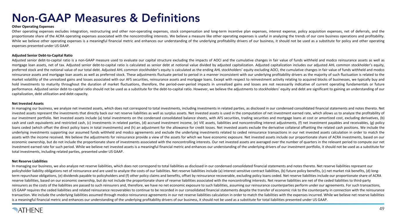 Non-GAAP Measures & Definitions 49 Other Operating Expenses Other operating expenses excludes integration, restructuring and other non-operating expenses, stock compensation and long-term incentive plan expenses, interest expense, policy acquisition expenses, net of deferrals, and the proportionate share of the ACRA operating expenses associated with the noncontrolling interests. We believe a measure like other operating expenses is useful in analyzing the trends of our core business operations and profitability. While we believe other operating expenses is a meaningful financial metric and enhances our understanding of the underlying profitability drivers of our business, it should not be used as a substitute for policy and other operating expenses presented under US GAAP. Adjusted Senior Debt-to-Capital Ratio Adjusted senior debt-to-capital ratio is a non-GAAP measure used to evaluate our capital structure excluding the impacts of AOCI and the cumulative changes in fair value of funds withheld and modco reinsurance assets as well as mortgage loan assets, net of tax. Adjusted senior debt-to-capital ratio is calculated as senior debt at notional value divided by adjusted capitalization. Adjusted capitalization includes our adjusted AHL common stockholder’s equity, preferred stock and the notional value of our total debt. Adjusted AHL common stockholder’s equity is calculated as the ending AHL stockholders’ equity excluding AOCI, the cumulative changes in fair value of funds withheld and modco reinsurance assets and mortgage loan assets as well as preferred stock. These adjustments fluctuate period to period in a manner inconsistent with our underlying profitability drivers as the majority of such fluctuation is related to the market volatility of the unrealized gains and losses associated with our AFS securities, reinsurance assets and mortgage loans. Except with respect to reinvestment activity relating to acquired blocks of businesses, we typically buy and hold investments to maturity throughout the duration of market fluctuations, therefore, the period-over-period impacts in unrealized gains and losses are not necessarily indicative of current operating fundamentals or future performance. Adjusted senior debt-to-capital ratio should not be used as a substitute for the debt-to-capital ratio. However, we believe the adjustments to stockholders’ equity and debt are significant to gaining an understanding of our capitalization, debt utilization and debt capacity. Net Invested Assets In managing our business, we analyze net invested assets, which does not correspond to total investments, including investments in related parties, as disclosed in our condensed consolidated financial statements and notes thereto. Net invested assets represent the investments that directly back our net reserve liabilities as well as surplus assets. Net invested assets is used in the computation of net investment earned rate, which allows us to analyze the profitability of our investment portfolio. Net invested assets include (a) total investments on the condensed consolidated balance sheets, with AFS securities, trading securities and mortgage loans at cost or amortized cost, excluding derivatives, (b) cash and cash equivalents and restricted cash, (c) investments in related parties, (d) accrued investment income, (e) VIE assets, liabilities and noncontrolling interest adjustments, (f) net investment payables and receivables, (g) policy loans ceded (which offset the direct policy loans in total investments) and (h) an adjustment for the allowance for credit losses. Net invested assets exclude the derivative collateral offsetting the related cash positions. We include the underlying investments supporting our assumed funds withheld and modco agreements and exclude the underlying investments related to ceded reinsurance transactions in our net invested assets calculation in order to match the assets with the income received. We believe the adjustments for reinsurance provide a view of the assets for which we have economic exposure. Net invested assets include our proportionate share of ACRA investments, based on our economic ownership, but do not include the proportionate share of investments associated with the noncontrolling interests. Our net invested assets are averaged over the number of quarters in the relevant period to compute our net investment earned rate for such period. While we believe net invested assets is a meaningful financial metric and enhances our understanding of the underlying drivers of our investment portfolio, it should not be used as a substitute for total investments, including related parties, presented under US GAAP. Net Reserve Liabilities In managing our business, we also analyze net reserve liabilities, which does not correspond to total liabilities as disclosed in our condensed consolidated financial statements and notes thereto. Net reserve liabilities represent our policyholder liability obligations net of reinsurance and are used to analyze the costs of our liabilities. Net reserve liabilities include (a) interest sensitive contract liabilities, (b) future policy benefits, (c) net market risk benefits, (d) long- term repurchase obligations, (e) dividends payable to policyholders and (f) other policy claims and benefits, offset by reinsurance recoverable, excluding policy loans ceded. Net reserve liabilities include our proportionate share of ACRA reserve liabilities, based on our economic ownership, but do not include the proportionate share of reserve liabilities associated with the noncontrolling interests. Net reserve liabilities are net of the ceded liabilities to third-party reinsurers as the costs of the liabilities are passed to such reinsurers and, therefore, we have no net economic exposure to such liabilities, assuming our reinsurance counterparties perform under our agreements. For such transactions, US GAAP requires the ceded liabilities and related reinsur