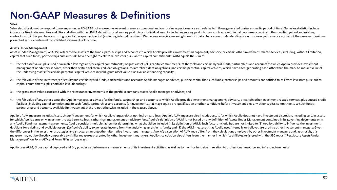 Non-GAAP Measures & Definitions 50 Sales Sales statistics do not correspond to revenues under US GAAP but are used as relevant measures to understand our business performance as it relates to inflows generated during a specific period of time. Our sales statistics include inflows for fixed rate annuities and FIAs and align with the LIMRA definition of all money paid into an individual annuity, including money paid into new contracts with initial purchase occurring in the specified period and existing contracts with initial purchase occurring prior to the specified period (excluding internal transfers). We believe sales is a meaningful metric that enhances our understanding of our business performance and is not the same as premiums presented in our condensed consolidated statements of income. Assets Under Management Assets Under Management, or AUM, refers to the assets of the funds, partnerships and accounts to which Apollo provides investment management, advisory, or certain other investment-related services, including, without limitation, capital that such funds, partnerships and accounts have the right to call from investors pursuant to capital commitments. AUM equals the sum of: 1. the net asset value, plus used or available leverage and/or capital commitments, or gross assets plus capital commitments, of the yield and certain hybrid funds, partnerships and accounts for which Apollo provides investment management or advisory services, other than certain collateralized loan obligations, collateralized debt obligations, and certain perpetual capital vehicles, which have a fee-generating basis other than the mark-to-market value of the underlying assets; for certain perpetual capital vehicles in yield, gross asset value plus available financing capacity; 2. the fair value of the investments of equity and certain hybrid funds, partnerships and accounts Apollo manages or advises, plus the capital that such funds, partnerships and accounts are entitled to call from investors pursuant to capital commitments, plus portfolio level financings; 3. the gross asset value associated with the reinsurance investments of the portfolio company assets Apollo manages or advises; and 4. the fair value of any other assets that Apollo manages or advises for the funds, partnerships and accounts to which Apollo provides investment management, advisory, or certain other investment-related services, plus unused credit facilities, including capital commitments to such funds, partnerships and accounts for investments that may require pre-qualification or other conditions before investment plus any other capital commitments to such funds, partnerships and accounts available for investment that are not otherwise included in the clauses above. Apollo’s AUM measure includes Assets Under Management for which Apollo charges either nominal or zero fees. Apollo’s AUM measure also includes assets for which Apollo does not have investment discretion, including certain assets for which Apollo earns only investment-related service fees, rather than management or advisory fees. Apollo’s definition of AUM is not based on any definition of Assets Under Management contained in its governing documents or in any Apollo Fund management agreements. Apollo considers multiple factors for determining what should be included in its definition of AUM. Such factors include but are not limited to (1) Apollo’s ability to influence the investment decisions for existing and available assets; (2) Apollo’s ability to generate income from the underlying assets in its funds; and (3) the AUM measures that Apollo uses internally or believes are used by other investment managers. Given the differences in the investment strategies and structures among other alternative investment managers, Apollo’s calculation of AUM may differ from the calculations employed by other investment managers and, as a result, this measure may not be directly comparable to similar measures presented by other investment managers. Apollo’s calculation also differs from the manner in which its affiliates registered with the SEC report “Regulatory Assets Under Management” on Form ADV and Form PF in various ways. Apollo uses AUM, Gross capital deployed and Dry powder as performance measurements of its investment activities, as well as to monitor fund size in relation to professional resource and infrastructure needs.