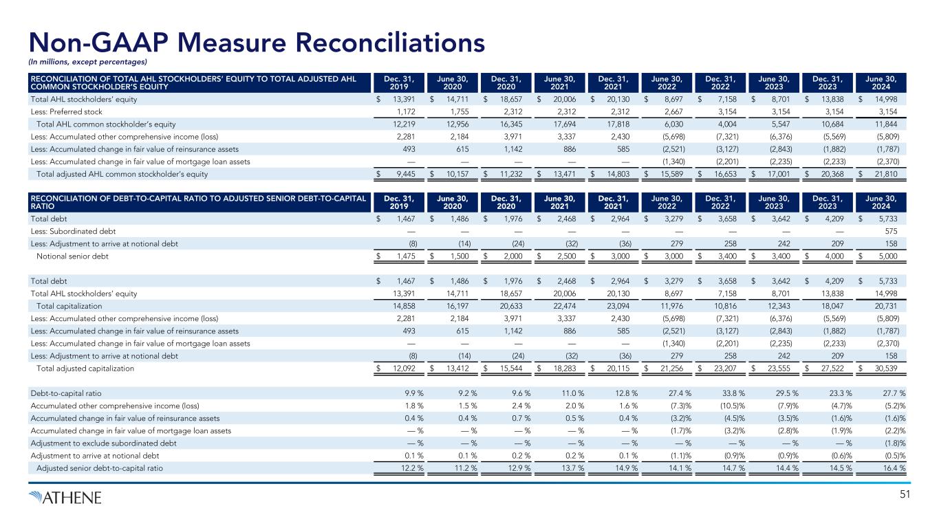 Non-GAAP Measure Reconciliations (In millions, except percentages) 51 RECONCILIATION OF TOTAL AHL STOCKHOLDERS’ EQUITY TO TOTAL ADJUSTED AHL COMMON STOCKHOLDER’S EQUITY Dec. 31, 2019 June 30, 2020 Dec. 31, 2020 June 30, 2021 Dec. 31, 2021 June 30, 2022 Dec. 31, 2022 June 30, 2023 Dec. 31, 2023 June 30, 2024 Total AHL stockholders’ equity $ 13,391 $ 14,711 $ 18,657 $ 20,006 $ 20,130 $ 8,697 $ 7,158 $ 8,701 $ 13,838 $ 14,998 Less: Preferred stock 1,172 1,755 2,312 2,312 2,312 2,667 3,154 3,154 3,154 3,154 Total AHL common stockholder’s equity 12,219 12,956 16,345 17,694 17,818 6,030 4,004 5,547 10,684 11,844 Less: Accumulated other comprehensive income (loss) 2,281 2,184 3,971 3,337 2,430 (5,698) (7,321) (6,376) (5,569) (5,809) Less: Accumulated change in fair value of reinsurance assets 493 615 1,142 886 585 (2,521) (3,127) (2,843) (1,882) (1,787) Less: Accumulated change in fair value of mortgage loan assets — — — — — (1,340) (2,201) (2,235) (2,233) (2,370) Total adjusted AHL common stockholder’s equity $ 9,445 $ 10,157 $ 11,232 $ 13,471 $ 14,803 $ 15,589 $ 16,653 $ 17,001 $ 20,368 $ 21,810 RECONCILIATION OF DEBT-TO-CAPITAL RATIO TO ADJUSTED SENIOR DEBT-TO-CAPITAL RATIO Dec. 31, 2019 June 30, 2020 Dec. 31, 2020 June 30, 2021 Dec. 31, 2021 June 30, 2022 Dec. 31, 2022 June 30, 2023 Dec. 31, 2023 June 30, 2024 Total debt $ 1,467 $ 1,486 $ 1,976 $ 2,468 $ 2,964 $ 3,279 $ 3,658 $ 3,642 $ 4,209 $ 5,733 Less: Subordinated debt — — — — — — — — — 575 Less: Adjustment to arrive at notional debt (8) (14) (24) (32) (36) 279 258 242 209 158 Notional senior debt $ 1,475 $ 1,500 $ 2,000 $ 2,500 $ 3,000 $ 3,000 $ 3,400 $ 3,400 $ 4,000 $ 5,000 Total debt $ 1,467 $ 1,486 $ 1,976 $ 2,468 $ 2,964 $ 3,279 $ 3,658 $ 3,642 $ 4,209 $ 5,733 Total AHL stockholders’ equity 13,391 14,711 18,657 20,006 20,130 8,697 7,158 8,701 13,838 14,998 Total capitalization 14,858 16,197 20,633 22,474 23,094 11,976 10,816 12,343 18,047 20,731 Less: Accumulated other comprehensive income (loss) 2,281 2,184 3,971 3,337 2,430 (5,698) (7,321) (6,376) (5,569) (5,809) Less: Accumulated change in fair value of reinsurance assets 493 615 1,142 886 585 (2,521) (3,127) (2,843) (1,882) (1,787) Less: Accumulated change in fair value of mortgage loan assets — — — — — (1,340) (2,201) (2,235) (2,233) (2,370) Less: Adjustment to arrive at notional debt (8) (14) (24) (32) (36) 279 258 242 209 158 Total adjusted capitalization $ 12,092 $ 13,412 $ 15,544 $ 18,283 $ 20,115 $ 21,256 $ 23,207 $ 23,555 $ 27,522 $ 30,539 Debt-to-capital ratio 9.9 % 9.2 % 9.6 % 11.0 % 12.8 % 27.4 % 33.8 % 29.5 % 23.3 % 27.7 % Accumulated other comprehensive income (loss) 1.8 % 1.5 % 2.4 % 2.0 % 1.6 % (7.3) % (10.5) % (7.9) % (4.7) % (5.2) % Accumulated change in fair value of reinsurance assets 0.4 % 0.4 % 0.7 % 0.5 % 0.4 % (3.2) % (4.5) % (3.5) % (1.6) % (1.6) % Accumulated change in fair value of mortgage loan assets — % — % — % — % — % (1.7) % (3.2) % (2.8) % (1.9) % (2.2) % Adjustment to exclude subordinated debt — % — % — % — % — % — % — % — % — % (1.8) % Adjustment to arrive at notional debt 0.1 % 0.1 % 0.2 % 0.2 % 0.1 % (1.1) % (0.9) % (0.9) % (0.6) % (0.5) % Adjusted senior debt-to-capital ratio 12.2 % 11.2 % 12.9 % 13.7 % 14.9 % 14.1 % 14.7 % 14.4 % 14.5 % 16.4 %