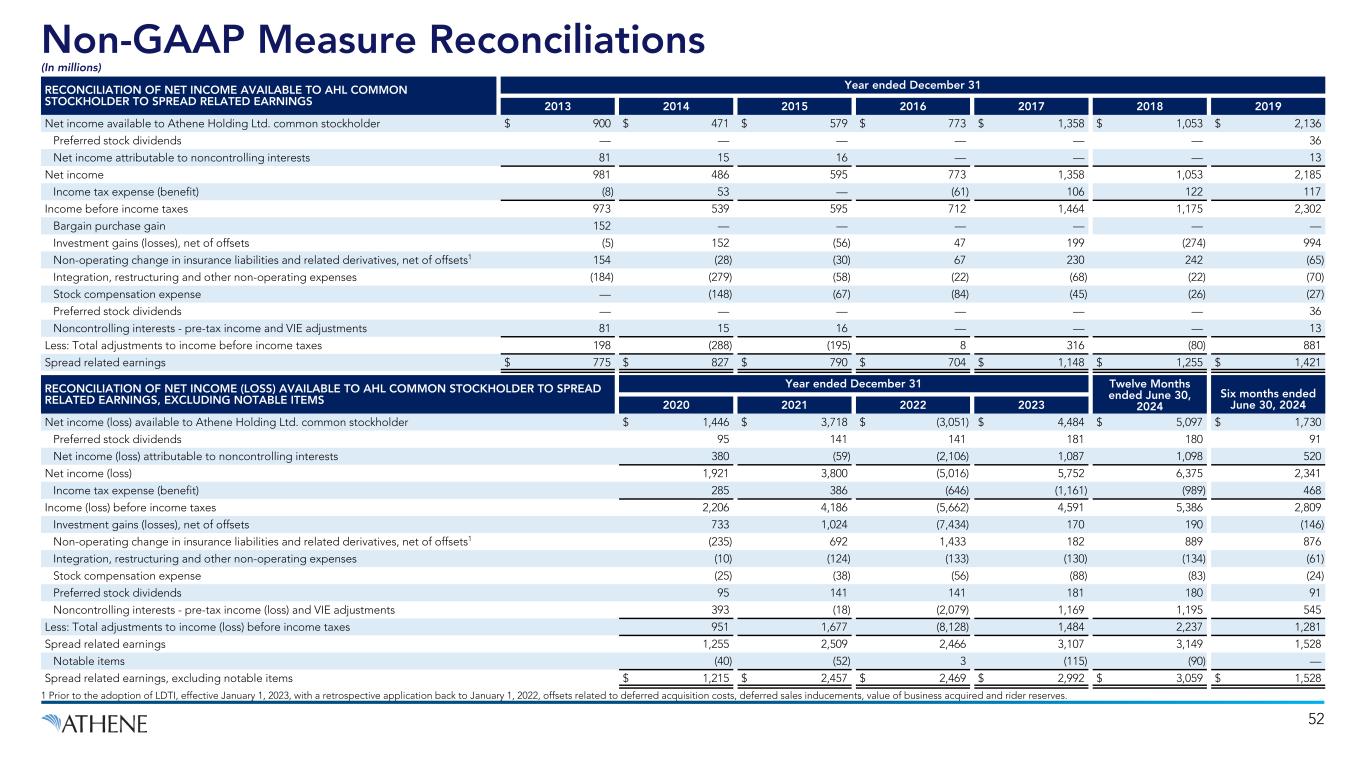 Non-GAAP Measure Reconciliations (In millions) 52 RECONCILIATION OF NET INCOME AVAILABLE TO AHL COMMON STOCKHOLDER TO SPREAD RELATED EARNINGS Year ended December 31 2013 2014 2015 2016 2017 2018 2019 Net income available to Athene Holding Ltd. common stockholder $ 900 $ 471 $ 579 $ 773 $ 1,358 $ 1,053 $ 2,136 Preferred stock dividends — — — — — — 36 Net income attributable to noncontrolling interests 81 15 16 — — — 13 Net income 981 486 595 773 1,358 1,053 2,185 Income tax expense (benefit) (8) 53 — (61) 106 122 117 Income before income taxes 973 539 595 712 1,464 1,175 2,302 Bargain purchase gain 152 — — — — — — Investment gains (losses), net of offsets (5) 152 (56) 47 199 (274) 994 Non-operating change in insurance liabilities and related derivatives, net of offsets1 154 (28) (30) 67 230 242 (65) Integration, restructuring and other non-operating expenses (184) (279) (58) (22) (68) (22) (70) Stock compensation expense — (148) (67) (84) (45) (26) (27) Preferred stock dividends — — — — — — 36 Noncontrolling interests - pre-tax income and VIE adjustments 81 15 16 — — — 13 Less: Total adjustments to income before income taxes 198 (288) (195) 8 316 (80) 881 Spread related earnings $ 775 $ 827 $ 790 $ 704 $ 1,148 $ 1,255 $ 1,421 RECONCILIATION OF NET INCOME (LOSS) AVAILABLE TO AHL COMMON STOCKHOLDER TO SPREAD RELATED EARNINGS, EXCLUDING NOTABLE ITEMS Year ended December 31 Twelve Months ended June 30, 2024 Six months ended June 30, 20242020 2021 2022 2023 Net income (loss) available to Athene Holding Ltd. common stockholder $ 1,446 $ 3,718 $ (3,051) $ 4,484 $ 5,097 $ 1,730 Preferred stock dividends 95 141 141 181 180 91 Net income (loss) attributable to noncontrolling interests 380 (59) (2,106) 1,087 1,098 520 Net income (loss) 1,921 3,800 (5,016) 5,752 6,375 2,341 Income tax expense (benefit) 285 386 (646) (1,161) (989) 468 Income (loss) before income taxes 2,206 4,186 (5,662) 4,591 5,386 2,809 Investment gains (losses), net of offsets 733 1,024 (7,434) 170 190 (146) Non-operating change in insurance liabilities and related derivatives, net of offsets1 (235) 692 1,433 182 889 876 Integration, restructuring and other non-operating expenses (10) (124) (133) (130) (134) (61) Stock compensation expense (25) (38) (56) (88) (83) (24) Preferred stock dividends 95 141 141 181 180 91 Noncontrolling interests - pre-tax income (loss) and VIE adjustments 393 (18) (2,079) 1,169 1,195 545 Less: Total adjustments to income (loss) before income taxes 951 1,677 (8,128) 1,484 2,237 1,281 Spread related earnings 1,255 2,509 2,466 3,107 3,149 1,528 Notable items (40) (52) 3 (115) (90) — Spread related earnings, excluding notable items $ 1,215 $ 2,457 $ 2,469 $ 2,992 $ 3,059 $ 1,528 1 Prior to the adoption of LDTI, effective January 1, 2023, with a retrospective application back to January 1, 2022, offsets related to deferred acquisition costs, deferred sales inducements, value of business acquired and rider reserves.
