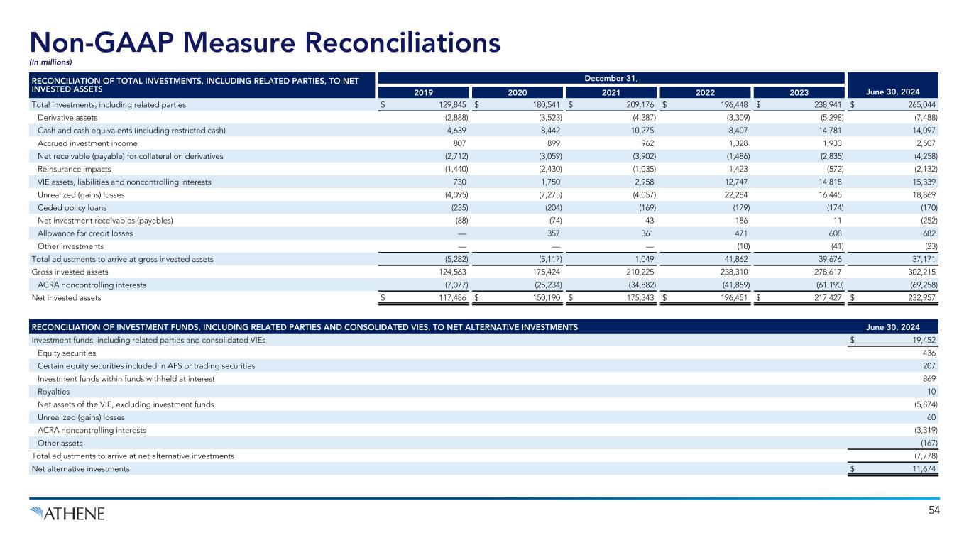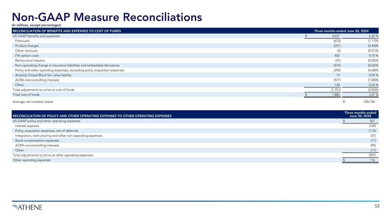 Non-GAAP Measure Reconciliations (In millions, except percentages) 53 RECONCILIATION OF BENEFITS AND EXPENSES TO COST OF FUNDS Three months ended June 30, 2024 US GAAP benefits and expenses $ 3,637 6.32 % Premiums (673) (1.17) % Product charges (251) (0.44) % Other revenues (3) (0.01) % FIA option costs 402 0.70 % Reinsurance impacts (31) (0.05) % Non-operating change in insurance liabilities and embedded derivatives (374) (0.65) % Policy and other operating expenses, excluding policy acquisition expenses (393) (0.68) % AmerUs Closed Block fair value liability 13 0.02 % ACRA noncontrolling interests (577) (1.00) % Other 130 0.23 % Total adjustments to arrive at cost of funds (1,757) (3.05) % Total cost of funds $ 1,880 3.27 % Average net invested assets $ 230,156 RECONCILIATION OF POLICY AND OTHER OPERATING EXPENSES TO OTHER OPERATING EXPENSES Three months ended June 30, 2024 US GAAP policy and other operating expenses $ 507 Interest expense (129) Policy acquisition expenses, net of deferrals (114) Integration, restructuring and other non-operating expenses (31) Stock compensation expenses (11) ACRA noncontrolling interests (95) Other (11) Total adjustments to arrive at other operating expenses (391) Other operating expenses $ 116