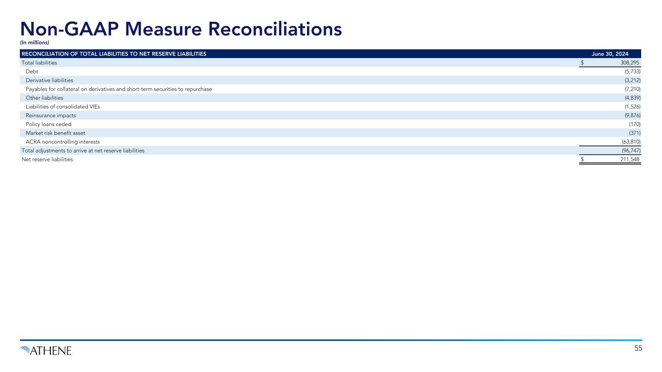 Non-GAAP Measure Reconciliations (In millions) 54 RECONCILIATION OF TOTAL INVESTMENTS, INCLUDING RELATED PARTIES, TO NET INVESTED ASSETS December 31, June 30, 20242019 2020 2021 2022 2023 Total investments, including related parties $ 129,845 $ 180,541 $ 209,176 $ 196,448 $ 238,941 $ 265,044 Derivative assets (2,888) (3,523) (4,387) (3,309) (5,298) (7,488) Cash and cash equivalents (including restricted cash) 4,639 8,442 10,275 8,407 14,781 14,097 Accrued investment income 807 899 962 1,328 1,933 2,507 Net receivable (payable) for collateral on derivatives (2,712) (3,059) (3,902) (1,486) (2,835) (4,258) Reinsurance impacts (1,440) (2,430) (1,035) 1,423 (572) (2,132) VIE assets, liabilities and noncontrolling interests 730 1,750 2,958 12,747 14,818 15,339 Unrealized (gains) losses (4,095) (7,275) (4,057) 22,284 16,445 18,869 Ceded policy loans (235) (204) (169) (179) (174) (170) Net investment receivables (payables) (88) (74) 43 186 11 (252) Allowance for credit losses — 357 361 471 608 682 Other investments — — — (10) (41) (23) Total adjustments to arrive at gross invested assets (5,282) (5,117) 1,049 41,862 39,676 37,171 Gross invested assets 124,563 175,424 210,225 238,310 278,617 302,215 ACRA noncontrolling interests (7,077) (25,234) (34,882) (41,859) (61,190) (69,258) Net invested assets $ 117,486 $ 150,190 $ 175,343 $ 196,451 $ 217,427 $ 232,957 RECONCILIATION OF INVESTMENT FUNDS, INCLUDING RELATED PARTIES AND CONSOLIDATED VIES, TO NET ALTERNATIVE INVESTMENTS June 30, 2024 Investment funds, including related parties and consolidated VIEs $ 19,452 Equity securities 436 Certain equity securities included in AFS or trading securities 207 Investment funds within funds withheld at interest 869 Royalties 10 Net assets of the VIE, excluding investment funds (5,874) Unrealized (gains) losses 60 ACRA noncontrolling interests (3,319) Other assets (167) Total adjustments to arrive at net alternative investments (7,778) Net alternative investments $ 11,674