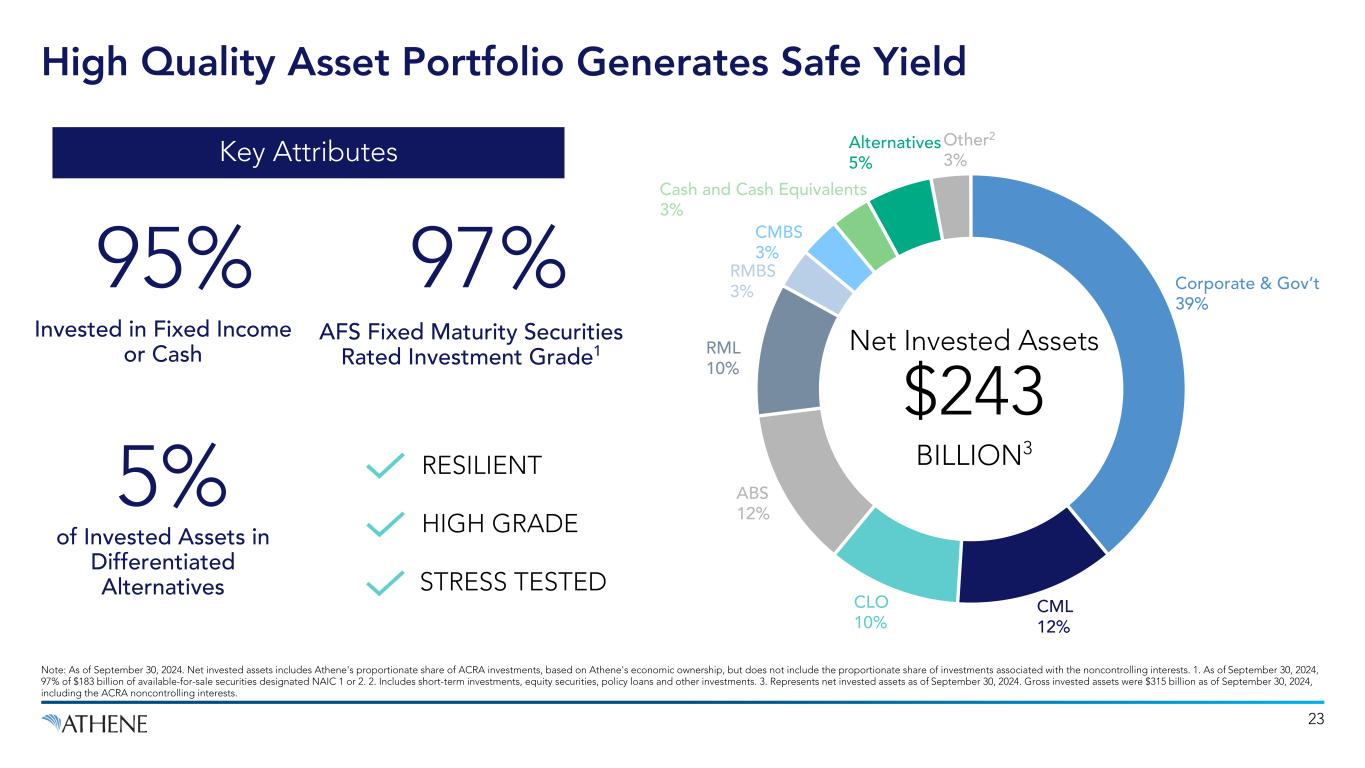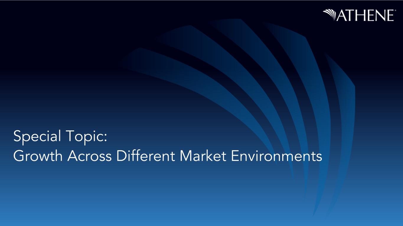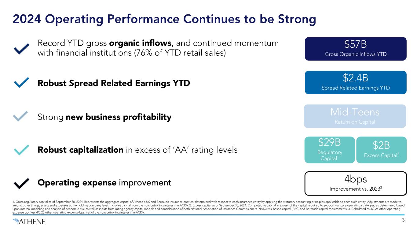 Disclaimer This presentation does not constitute an offer to sell, or the solicitation of an offer to buy, any security of Athene Holding Ltd. (“AHL” and together with its consolidated subsidiaries, “Athene”). This presentation is not intended to constitute a solicitation of any insurance policy or contract or application therefor. Unless the context requires otherwise, references in this presentation to “Apollo" and "AGM" refer to Apollo Global Management, Inc., together with its subsidiaries, references in this presentation to "AGM HoldCo" refer to Apollo Global Management, Inc., and references in this presentation to “AAM” refer to Apollo Asset Management, Inc., a subsidiary of Apollo Global Management, Inc. This presentation contains, and certain oral statements made by Athene’s representatives from time to time may contain, forward-looking statements within the meaning of the Private Securities Litigation Reform Act of 1995, Section 27A of the Securities Act of 1933, as amended, and Section 21E of the Securities Exchange Act of 1934, as amended. Such statements are subject to risks, uncertainties and assumptions that could cause actual results, events and developments to differ materially from those set forth in, or implied by, such statements. These statements are based on the beliefs and assumptions of Athene’s management. Generally, forward-looking statements include actions, events, results, strategies and expectations and are often identifiable by use of the words “believes,” “expects,” “intends,” “anticipates,” “plans,” “seeks,” “estimates,” “projects,” “may,” “will,” “could,” “might,” or “continues” or similar expressions. Forward- looking statements within this presentation include, but are not limited to, benefits to be derived from Athene's capital allocation decisions; the anticipated performance of Athene's portfolio in certain stress or recessionary environments; the performance of Athene's business; general economic conditions; expected future operating results; Athene's liquidity and capital resources; and other non-historical statements. Although Athene management believes that the expectations reflected in these forward-looking statements are reasonable, it can give no assurance that these expectations will prove to be correct. For a discussion of other risks and uncertainties related to Athene's forward-looking statements, see its annual report on Form 10-K for the year ended December 31, 2023 and quarterly report on Form 10-Q filed for the period ended September 30, 2024, which can be found at the SEC’s website at www.sec.gov. All forward- looking statements described herein are qualified by these cautionary statements and there can be no assurance that the actual results, events or developments referenced herein will occur or be realized. Athene does not undertake any obligation to update or revise forward-looking statements to reflect changed assumptions, the occurrence of unanticipated events or changes to future operating results. Athene adopted the US GAAP accounting standard related to Targeted Improvements to the Accounting for Long-Duration Contracts (LDTI) as of January 1, 2023, which required Athene to apply the new standard retrospectively back to January 1, 2022, the date of Athene’s merger with AGM. Certain 2022 US GAAP financial metrics and disclosures in this presentation have been retrospectively adjusted in accordance with the requirements of the adoption guidance of LDTI. Please refer to the discussion of Non-GAAP Measures and Definitions herein for additional information on items that are excluded from Athene’s non-GAAP measure of spread related earnings, which was retrospectively adjusted in accordance with the requirements of the adoption guidance of LDTI. Information contained herein may include information respecting prior performance of Athene. Information respecting prior performance, while a useful tool, is not necessarily indicative of actual results to be achieved in the future, which is dependent upon many factors, many of which are beyond Athene's control. The information contained herein is not a guarantee of future performance by Athene, and actual outcomes and results may differ materially from any historic, pro forma or projected financial results indicated herein. Certain of the financial information contained herein is unaudited or based on the application of non-GAAP financial measures. These non-GAAP financial measures should be considered in addition to and not as a substitute for, or superior to, financial measures presented in accordance with GAAP. Furthermore, certain financial information is based on estimates of management. These estimates, which are based on the reasonable expectations of management, are subject to change and there can be no assurance that they will prove to be correct. The information contained herein does not purport to be all-inclusive or contain all information that an evaluator may require in order to properly evaluate the business, prospects or value of Athene. Athene does not have any obligation to update this presentation and the information may change at any time without notice. Models that may be contained herein (the “Models”) are being provided for illustrative and discussion purposes only and are not intended to forecast or predict future events. Information provided in the Models may not reflect the most current data and is subject to change. The Models are based on estimates and assumptions that are also subject to change and may be subject to significant business, economic and competitive uncertainties, including numerous uncontrollable market and event driven situations. There is no guarantee that the information presented in the Models is accurate. Actual results may differ materially from those reflected and contemplated in such hypothetical, forward- looking information. Undue reliance should not be pla