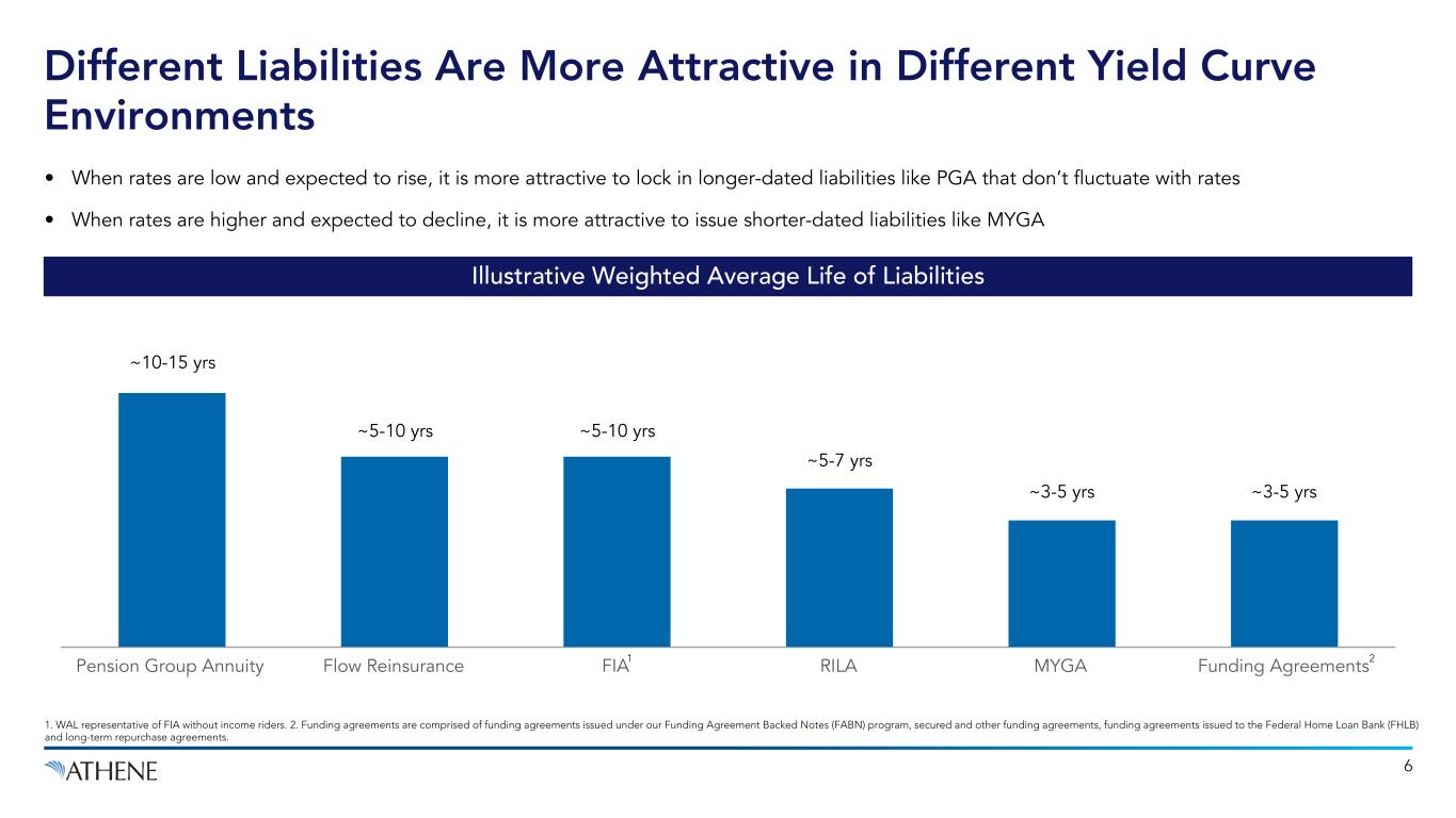 • When rates are low and expected to rise, it is more attractive to lock in longer-dated liabilities like PGA that don’t fluctuate with rates • When rates are higher and expected to decline, it is more attractive to issue shorter-dated liabilities like MYGA Pension Group Annuity Flow Reinsurance FIA RILA MYGA Funding Agreements Different Liabilities Are More Attractive in Different Yield Curve Environments 6 1. WAL representative of FIA without income riders. 2. Funding agreements are comprised of funding agreements issued under our Funding Agreement Backed Notes (FABN) program, secured and other funding agreements, funding agreements issued to the Federal Home Loan Bank (FHLB) and long-term repurchase agreements. ~10-15 yrs ~5-10 yrs ~5-10 yrs ~5-7 yrs ~3-5 yrs ~3-5 yrs Illustrative Weighted Average Life of Liabilities 1 2