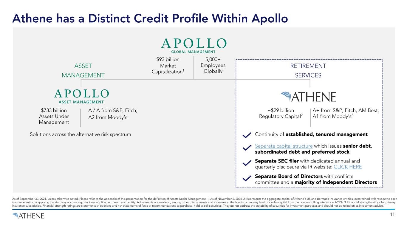 10 Key Highlights Reflect Relative Strength of Franchise ATHENE HAS BUILT A FORTRESS BALANCE SHEET DESIGNED TO DELIVER EFFICIENT GROWTH Highly rated and conservatively managed with robust excess capital and liquidity; strategic sidecars provide on-demand equity capital 3 DISCIPLINED OPERATORS WITH A PRINCIPAL MINDSET Athene prioritizes strong return generation through periods of accelerated and measured growth 2 5 ATHENE IS THE MARKET LEADER IN RETIREMENT SERVICES Attractive savings products provide guaranteed income to a growing and increasingly underprepared retirement population 1 INVESTMENT PORTFOLIO IS HIGH-QUALITY AND GENERATES SAFE YIELD Consistent net spread generation supported by Apollo’s proprietary investment grade origination; minimal credit losses 4 SCALABLE PLATFORM WITH DIVERSIFIED ORGANIC GROWTH CAPABILITIES Demonstrated ability to source stable, low-cost, long-dated funding across multiple organic business channels