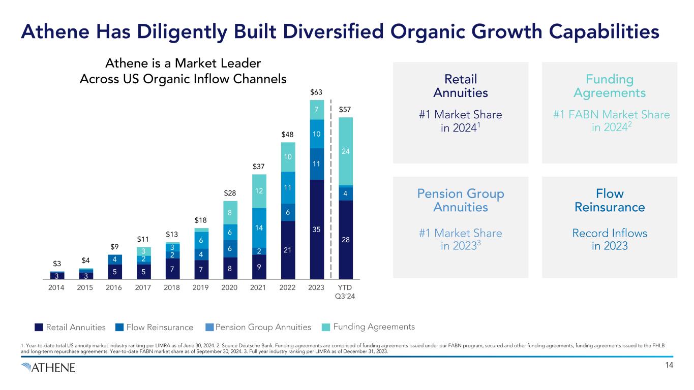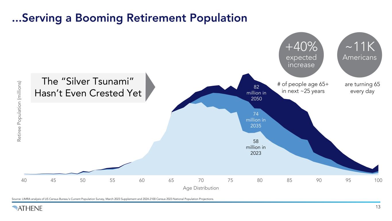 Leading market share in total US annuity market1 Rated ‘A+’ or equivalent by S&P, Fitch, AM Best, and Moody’s2 Policyholders in the US Gross invested assets; total GAAP assets of $355B Total employees include ~1,600 located in West Des Moines #1 Athene is a Leading Retirement Services Business... As of September 30, 2024, unless otherwise noted. 1. Refers to the retail annuity and FABN market rankings. Year-to-date total US annuity market industry ranking per Life Insurance Marketing and Research Association (LIMRA) as of June 30, 2024. Year-to-date FABN market share per Deutsche Bank as of September 30, 2024. 2. Includes ratings from S&P “A+”, Fitch “A+”, AM Best “A+”, and Moody’s “A1”. Financial strength ratings for primary insurance subsidiaries. Financial strength ratings are statements of opinions and not statements of facts or recommendations to purchase, hold or sell securities. They do not address the suitability of securities for investment purposes and should not be relied on as investment advice.3. Last twelve months ended September 30, 2024. $315B #1 ~2M ~2,000 A+ 12 LTM Spread Related Earnings $3.1B Market Leadership Significant Scale & Profitability Strong Balance Sheet & Capital Resources Rated ‘A+’ or Equivalent2 $315 billion Gross Invested Assets #1 Market Share1 ~2 Million Policyholders in the US $3.1 billion Spread Related Earnings3 Largest Sidecar in the Retirement Services Industry