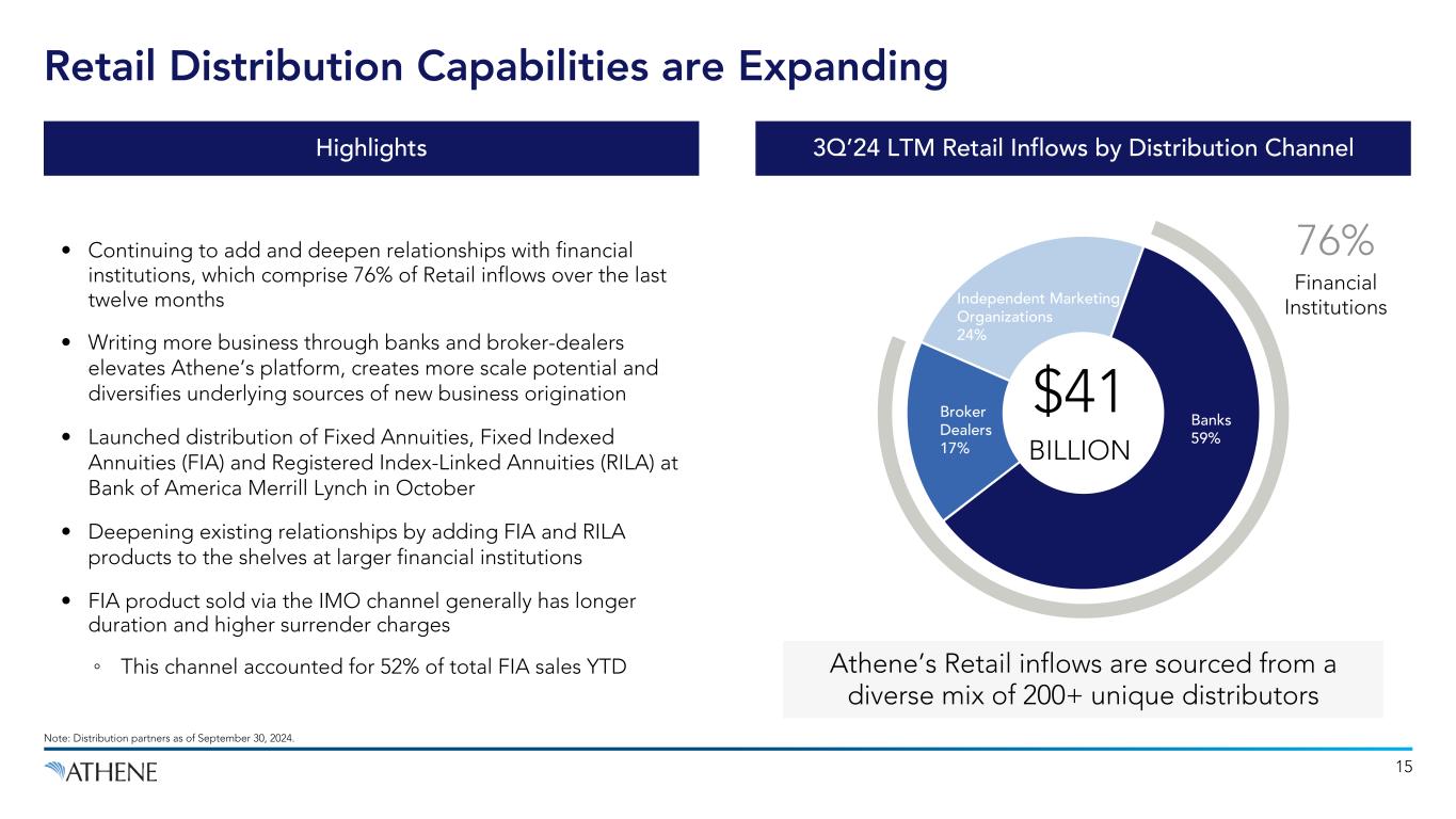 1. Year-to-date total US annuity market industry ranking per LIMRA as of June 30, 2024. 2. Source Deutsche Bank. Funding agreements are comprised of funding agreements issued under our FABN program, secured and other funding agreements, funding agreements issued to the FHLB and long-term repurchase agreements. Year-to-date FABN market share as of September 30, 2024. 3. Full year industry ranking per LIMRA as of December 31, 2023. $3 $4 $9 $11 $13 $18 $28 $37 $48 $63 $57 3 3 5 5 7 7 8 9 21 35 28 4 2 4 6 2 6 11 4 2 3 6 6 14 11 10 3 8 12 10 7 24 2014 2015 2016 2017 2018 2019 2020 2021 2022 2023 YTD Q3’24 14 Athene Has Diligently Built Diversified Organic Growth Capabilities Funding AgreementsRetail Annuities Flow Reinsurance Pension Group Annuities Athene is a Market Leader Across US Organic Inflow Channels Pension Group Annuities #1 Market Share in 20233 Funding Agreements #1 FABN Market Share in 20242 Retail Annuities #1 Market Share in 20241 Flow Reinsurance Record Inflows in 2023