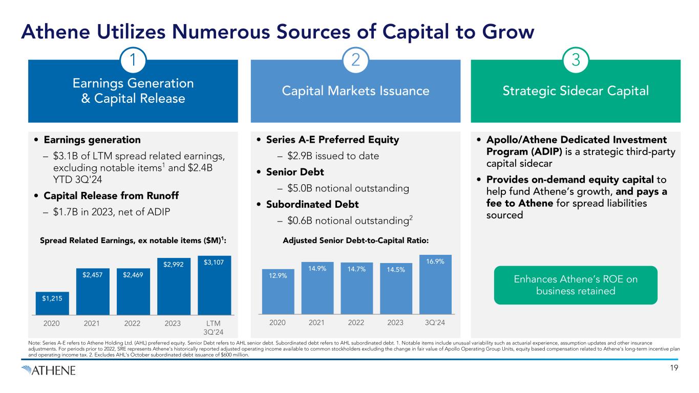 18 Strong Capital and Liquidity Profile Note: Athene metrics are net of the noncontrolling interests in ACRA, as of September 30, 2024, unless otherwise noted. 1. The consolidated risk-based capital ratio of our non-US reinsurance and US insurance subsidiaries calculated by aggregating US RBC and Bermuda RBC. 2. The CAL RBC ratio for Athene Annuity & Life Assurance Company, our parent US insurance company, which merged with and into Athene Annuity & Life Company on October 11, 2024. 3. The risk-based capital ratio of our non-US reinsurance subsidiaries calculated using Bermuda capital as defined in our Form 10-Q for the period ended September 30, 2024 and applying NAIC risk-based capital factors on an aggregate basis, excluding US subsidiaries which are included within our US RBC Ratio and limiting RBC concentration charges such that when they are applied to determine target capital, the charges do not exceed 100% of the asset’s carrying value. 4. Relates to the $2.6 billion liquidity facility, with $0.5 billion accordion feature available to AHL and ALRe and the $1.25 billion credit facility, with $0.5 billion accordion feature available to AHL. Availability of accordion features subject to lender consent and other factors. 5. Relates to $3.2 billion of available FHLB borrowing capacity. 6. Includes investment grade market value of $43.1 billion of public corporate bonds, $4.3 billion of US government and agencies, $1.6 billion of state and municipal bonds, and $0.9 billion of agency RMBS; excludes pledged assets, mainly associated with funding agreement and repurchase agreement liabilities, but includes assets held in reinsurance trusts. 412% 2023 Consolidated RBC Ratio1 392% 2023 US RBC Ratio2 400% 2023 Bermuda RBC Ratio3 Athene’s Available Liquidity ($B) $68.4 Liquid Assets6 5 49.9 Cash & Cash Equivalents1 $8.4 Committed Repurchase Facilities3 2.0 Credit Facilities42 4.9 Other Liquidity54 3.2 Total Available Liquidity