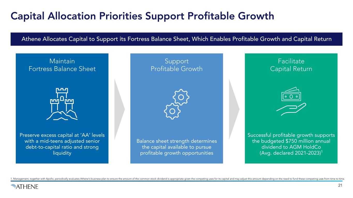20 Strategic Sidecar Supports Athene’s Growth with On-Demand Equity Capital Note: Past performance is not a guarantee of future results. 1. Includes ADIP called capital, leverage and reinvested earnings. Capital Deployed Since Inception1 ~$7.5B Direct equity capital to support Athene’s growth Greater third-party participation & capital efficiency for Athene Enhances Athene’s ROE on business retained ADIP II largest sidecar in the industry Strong investment performance since inception in 2019 ADIP Support of Marginal Growth Since 20192 ~25% Cumulative ADIP Capital Deployed1 Strong ADIP Returns Rewarded with Significant Upsize Shareholder-Friendly Solution $7.5B Supports Athene’s growth initiatives while maintaining strong capital position Enhances Athene’s ROE on business retained 20 $3.3B $6B ADIP I (2019) ADIP II (2024) Largest Sidecar in Retirement Services Industry #1