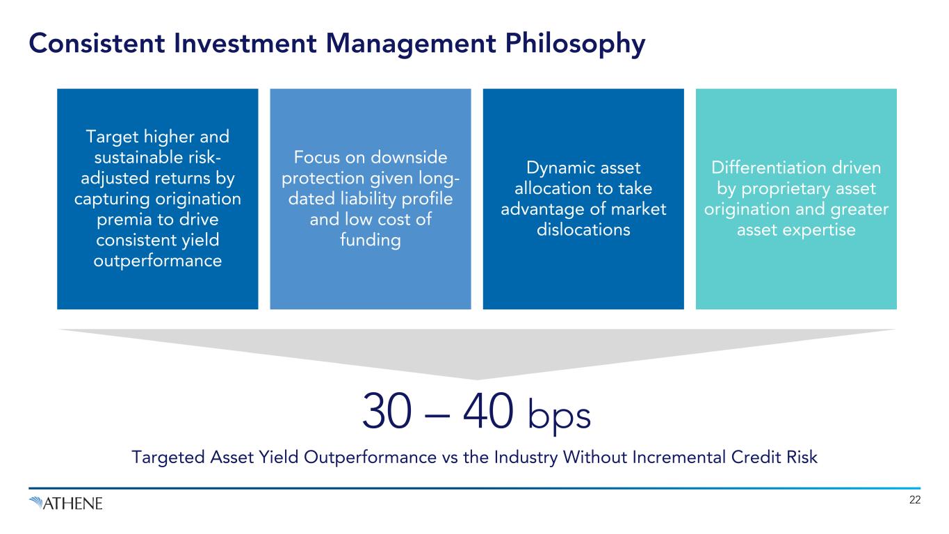 21 Capital Allocation Priorities Support Profitable Growth Balance sheet strength determines the capital available to pursue profitable growth opportunities Support Profitable Growth Preserve excess capital at ‘AA’ levels with a mid-teens adjusted senior debt-to-capital ratio and strong liquidity Maintain Fortress Balance Sheet Athene Allocates Capital to Support its Fortress Balance Sheet, Which Enables Profitable Growth and Capital Return Successful profitable growth supports the budgeted $750 million annual dividend to AGM HoldCo (Avg. declared 2021-2023)1 Facilitate Capital Return 1. Management, together with Apollo, periodically evaluates Athene’s business plan to ensure the amount of the common stock dividend is appropriate given the competing uses for its capital and may adjust this amount depending on the need to fund these competing uses from time to time.