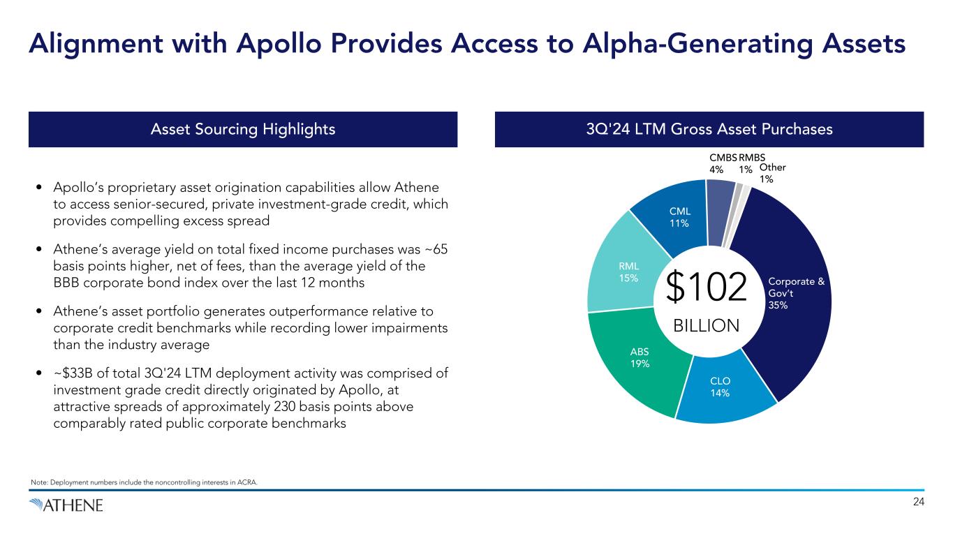 Corporate & Gov’t 39% CML 12% CLO 10% ABS 12% RML 10% RMBS 3% CMBS 3% Cash and Cash Equivalents 3% Alternatives 5% Other 3% Net Invested Assets $243 BILLION3 Note: As of September 30, 2024. Net invested assets includes Athene's proportionate share of ACRA investments, based on Athene's economic ownership, but does not include the proportionate share of investments associated with the noncontrolling interests. 1. As of September 30, 2024, 97% of $183 billion of available-for-sale securities designated NAIC 1 or 2. 2. Includes short-term investments, equity securities, policy loans and other investments. 3. Represents net invested assets as of September 30, 2024. Gross invested assets were $315 billion as of September 30, 2024, including the ACRA noncontrolling interests. High Quality Asset Portfolio Generates Safe Yield AFS Fixed Maturity Securities Rated Investment Grade1 RESILIENT HIGH GRADE STRESS TESTED 97% Invested in Fixed Income or Cash 95% of Invested Assets in Differentiated Alternatives 5% 23 Key Attributes 2