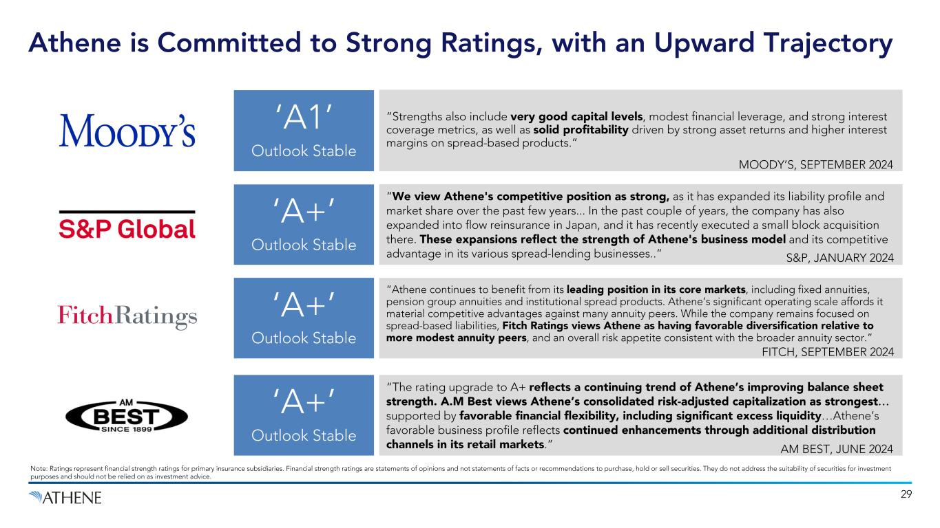 “The rating upgrade to A+ reflects a continuing trend of Athene’s improving balance sheet strength. A.M Best views Athene’s consolidated risk-adjusted capitalization as strongest… supported by favorable financial flexibility, including significant excess liquidity…Athene’s favorable business profile reflects continued enhancements through additional distribution channels in its retail markets.” “Strengths also include very good capital levels, modest financial leverage, and strong interest coverage metrics, as well as solid profitability driven by strong asset returns and higher interest margins on spread-based products.” ‘A1’ Outlook Stable 29 ‘A+’ Outlook Stable “Athene continues to benefit from its leading position in its core markets, including fixed annuities, pension group annuities and institutional spread products. Athene’s significant operating scale affords it material competitive advantages against many annuity peers. While the company remains focused on spread-based liabilities, Fitch Ratings views Athene as having favorable diversification relative to more modest annuity peers, and an overall risk appetite consistent with the broader annuity sector.” “We view Athene's competitive position as strong, as it has expanded its liability profile and market share over the past few years... In the past couple of years, the company has also expanded into flow reinsurance in Japan, and it has recently executed a small block acquisition there. These expansions reflect the strength of Athene's business model and its competitive advantage in its various spread-lending businesses..” ‘A+’ Outlook Stable ‘A+’ Outlook Stable S&P, JANUARY 2024 FITCH, SEPTEMBER 2024 AM BEST, JUNE 2024 MOODY’S, SEPTEMBER 2024 Note: Ratings represent financial strength ratings for primary insurance subsidiaries. Financial strength ratings are statements of opinions and not statements of facts or recommendations to purchase, hold or sell securities. They do not address the suitability of securities for investment purposes and should not be relied on as investment advice. Athene is Committed to Strong Ratings, with an Upward Trajectory