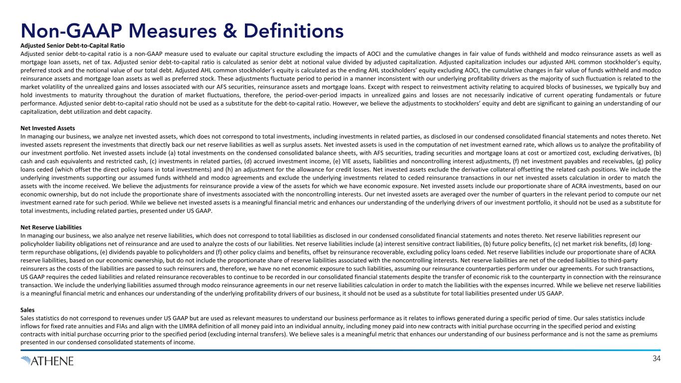 Non-GAAP Measures & Definitions 34 Adjusted Senior Debt-to-Capital Ratio Adjusted senior debt-to-capital ratio is a non-GAAP measure used to evaluate our capital structure excluding the impacts of AOCI and the cumulative changes in fair value of funds withheld and modco reinsurance assets as well as mortgage loan assets, net of tax. Adjusted senior debt-to-capital ratio is calculated as senior debt at notional value divided by adjusted capitalization. Adjusted capitalization includes our adjusted AHL common stockholder’s equity, preferred stock and the notional value of our total debt. Adjusted AHL common stockholder’s equity is calculated as the ending AHL stockholders’ equity excluding AOCI, the cumulative changes in fair value of funds withheld and modco reinsurance assets and mortgage loan assets as well as preferred stock. These adjustments fluctuate period to period in a manner inconsistent with our underlying profitability drivers as the majority of such fluctuation is related to the market volatility of the unrealized gains and losses associated with our AFS securities, reinsurance assets and mortgage loans. Except with respect to reinvestment activity relating to acquired blocks of businesses, we typically buy and hold investments to maturity throughout the duration of market fluctuations, therefore, the period-over-period impacts in unrealized gains and losses are not necessarily indicative of current operating fundamentals or future performance. Adjusted senior debt-to-capital ratio should not be used as a substitute for the debt-to-capital ratio. However, we believe the adjustments to stockholders’ equity and debt are significant to gaining an understanding of our capitalization, debt utilization and debt capacity. Net Invested Assets In managing our business, we analyze net invested assets, which does not correspond to total investments, including investments in related parties, as disclosed in our condensed consolidated financial statements and notes thereto. Net invested assets represent the investments that directly back our net reserve liabilities as well as surplus assets. Net invested assets is used in the computation of net investment earned rate, which allows us to analyze the profitability of our investment portfolio. Net invested assets include (a) total investments on the condensed consolidated balance sheets, with AFS securities, trading securities and mortgage loans at cost or amortized cost, excluding derivatives, (b) cash and cash equivalents and restricted cash, (c) investments in related parties, (d) accrued investment income, (e) VIE assets, liabilities and noncontrolling interest adjustments, (f) net investment payables and receivables, (g) policy loans ceded (which offset the direct policy loans in total investments) and (h) an adjustment for the allowance for credit losses. Net invested assets exclude the derivative collateral offsetting the related cash positions. We include the underlying investments supporting our assumed funds withheld and modco agreements and exclude the underlying investments related to ceded reinsurance transactions in our net invested assets calculation in order to match the assets with the income received. We believe the adjustments for reinsurance provide a view of the assets for which we have economic exposure. Net invested assets include our proportionate share of ACRA investments, based on our economic ownership, but do not include the proportionate share of investments associated with the noncontrolling interests. Our net invested assets are averaged over the number of quarters in the relevant period to compute our net investment earned rate for such period. While we believe net invested assets is a meaningful financial metric and enhances our understanding of the underlying drivers of our investment portfolio, it should not be used as a substitute for total investments, including related parties, presented under US GAAP. Net Reserve Liabilities In managing our business, we also analyze net reserve liabilities, which does not correspond to total liabilities as disclosed in our condensed consolidated financial statements and notes thereto. Net reserve liabilities represent our policyholder liability obligations net of reinsurance and are used to analyze the costs of our liabilities. Net reserve liabilities include (a) interest sensitive contract liabilities, (b) future policy benefits, (c) net market risk benefits, (d) long- term repurchase obligations, (e) dividends payable to policyholders and (f) other policy claims and benefits, offset by reinsurance recoverable, excluding policy loans ceded. Net reserve liabilities include our proportionate share of ACRA reserve liabilities, based on our economic ownership, but do not include the proportionate share of reserve liabilities associated with the noncontrolling interests. Net reserve liabilities are net of the ceded liabilities to third-party reinsurers as the costs of the liabilities are passed to such reinsurers and, therefore, we have no net economic exposure to such liabilities, assuming our reinsurance counterparties perform under our agreements. For such transactions, US GAAP requires the ceded liabilities and related reinsurance recoverables to continue to be recorded in our consolidated financial statements despite the transfer of economic risk to the counterparty in connection with the reinsurance transaction. We include the underlying liabilities assumed through modco reinsurance agreements in our net reserve liabilities calculation in order to match the liabilities with the expenses incurred. While we believe net reserve liabilities is a meaningful financial metric and enhances our understanding of the underlying profitability drivers of our business, it should not be used as a substitute for total liabilities presented under US GAAP. Sales Sales statistics do not correspond to revenues under US GAAP but are used as relevant measures to understand our busi