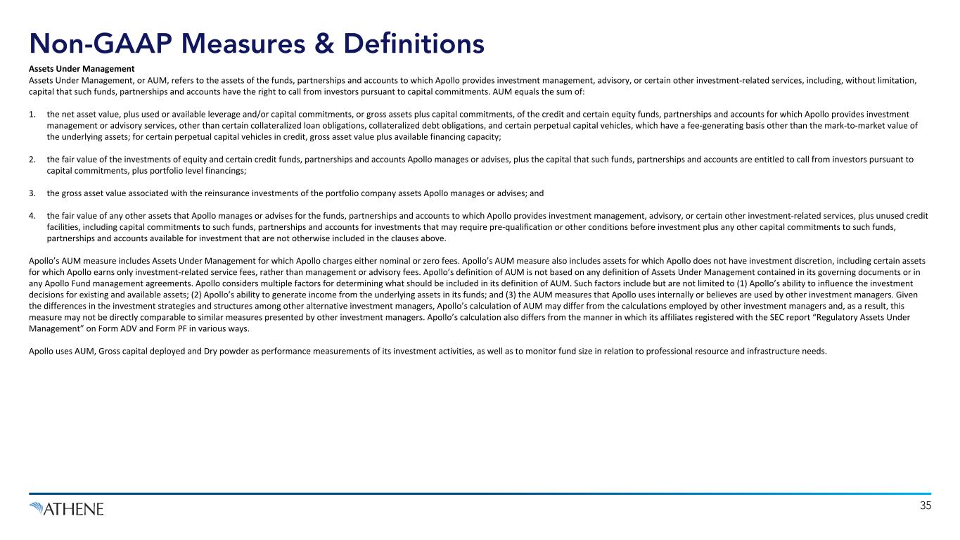 Non-GAAP Measures & Definitions 35 Assets Under Management Assets Under Management, or AUM, refers to the assets of the funds, partnerships and accounts to which Apollo provides investment management, advisory, or certain other investment-related services, including, without limitation, capital that such funds, partnerships and accounts have the right to call from investors pursuant to capital commitments. AUM equals the sum of: 1. the net asset value, plus used or available leverage and/or capital commitments, or gross assets plus capital commitments, of the credit and certain equity funds, partnerships and accounts for which Apollo provides investment management or advisory services, other than certain collateralized loan obligations, collateralized debt obligations, and certain perpetual capital vehicles, which have a fee-generating basis other than the mark-to-market value of the underlying assets; for certain perpetual capital vehicles in credit, gross asset value plus available financing capacity; 2. the fair value of the investments of equity and certain credit funds, partnerships and accounts Apollo manages or advises, plus the capital that such funds, partnerships and accounts are entitled to call from investors pursuant to capital commitments, plus portfolio level financings; 3. the gross asset value associated with the reinsurance investments of the portfolio company assets Apollo manages or advises; and 4. the fair value of any other assets that Apollo manages or advises for the funds, partnerships and accounts to which Apollo provides investment management, advisory, or certain other investment-related services, plus unused credit facilities, including capital commitments to such funds, partnerships and accounts for investments that may require pre-qualification or other conditions before investment plus any other capital commitments to such funds, partnerships and accounts available for investment that are not otherwise included in the clauses above. Apollo’s AUM measure includes Assets Under Management for which Apollo charges either nominal or zero fees. Apollo’s AUM measure also includes assets for which Apollo does not have investment discretion, including certain assets for which Apollo earns only investment-related service fees, rather than management or advisory fees. Apollo’s definition of AUM is not based on any definition of Assets Under Management contained in its governing documents or in any Apollo Fund management agreements. Apollo considers multiple factors for determining what should be included in its definition of AUM. Such factors include but are not limited to (1) Apollo’s ability to influence the investment decisions for existing and available assets; (2) Apollo’s ability to generate income from the underlying assets in its funds; and (3) the AUM measures that Apollo uses internally or believes are used by other investment managers. Given the differences in the investment strategies and structures among other alternative investment managers, Apollo’s calculation of AUM may differ from the calculations employed by other investment managers and, as a result, this measure may not be directly comparable to similar measures presented by other investment managers. Apollo’s calculation also differs from the manner in which its affiliates registered with the SEC report “Regulatory Assets Under Management” on Form ADV and Form PF in various ways. Apollo uses AUM, Gross capital deployed and Dry powder as performance measurements of its investment activities, as well as to monitor fund size in relation to professional resource and infrastructure needs.