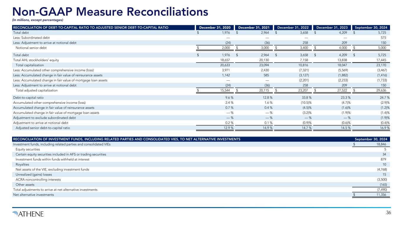 36 RECONCILIATION OF DEBT-TO-CAPITAL RATIO TO ADJUSTED SENIOR DEBT-TO-CAPITAL RATIO December 31, 2020 December 31, 2021 December 31, 2022 December 31, 2023 September 30, 2024 Total debt $ 1,976 $ 2,964 $ 3,658 $ 4,209 $ 5,725 Less: Subordinated debt — — — — 575 Less: Adjustment to arrive at notional debt (24) (36) 258 209 150 Notional senior debt $ 2,000 $ 3,000 $ 3,400 $ 4,000 $ 5,000 Total debt $ 1,976 $ 2,964 $ 3,658 $ 4,209 $ 5,725 Total AHL stockholders’ equity 18,657 20,130 7,158 13,838 17,445 Total capitalization 20,633 23,094 10,816 18,047 23,170 Less: Accumulated other comprehensive income (loss) 3,971 2,430 (7,321) (5,569) (3,467) Less: Accumulated change in fair value of reinsurance assets 1,142 585 (3,127) (1,882) (1,416) Less: Accumulated change in fair value of mortgage loan assets — — (2,201) (2,233) (1,733) Less: Adjustment to arrive at notional debt (24) (36) 258 209 150 Total adjusted capitalization $ 15,544 $ 20,115 $ 23,207 $ 27,522 $ 29,636 Debt-to-capital ratio 9.6 % 12.8 % 33.8 % 23.3 % 24.7 % Accumulated other comprehensive income (loss) 2.4 % 1.6 % (10.5) % (4.7) % (2.9) % Accumulated change in fair value of reinsurance assets 0.7 % 0.4 % (4.5) % (1.6) % (1.2) % Accumulated change in fair value of mortgage loan assets — % — % (3.2) % (1.9) % (1.4) % Adjustment to exclude subordinated debt — % — % — % — % (1.9) % Adjustment to arrive at notional debt 0.2 % 0.1 % (0.9) % (0.6) % (0.4) % Adjusted senior debt-to-capital ratio 12.9 % 14.9 % 14.7 % 14.5 % 16.9 % RECONCILIATION OF INVESTMENT FUNDS, INCLUDING RELATED PARTIES AND CONSOLIDATED VIES, TO NET ALTERNATIVE INVESTMENTS September 30, 2024 Investment funds, including related parties and consolidated VIEs $ 18,846 Equity securities 5 Certain equity securities included in AFS or trading securities 34 Investment funds within funds withheld at interest 879 Royalties 10 Net assets of the VIE, excluding investment funds (4,768) Unrealized (gains) losses 15 ACRA noncontrolling interests (3,500) Other assets (165) Total adjustments to arrive at net alternative investments (7,490) Net alternative investments $ 11,356 Non-GAAP Measure Reconciliations (In millions, except percentages)