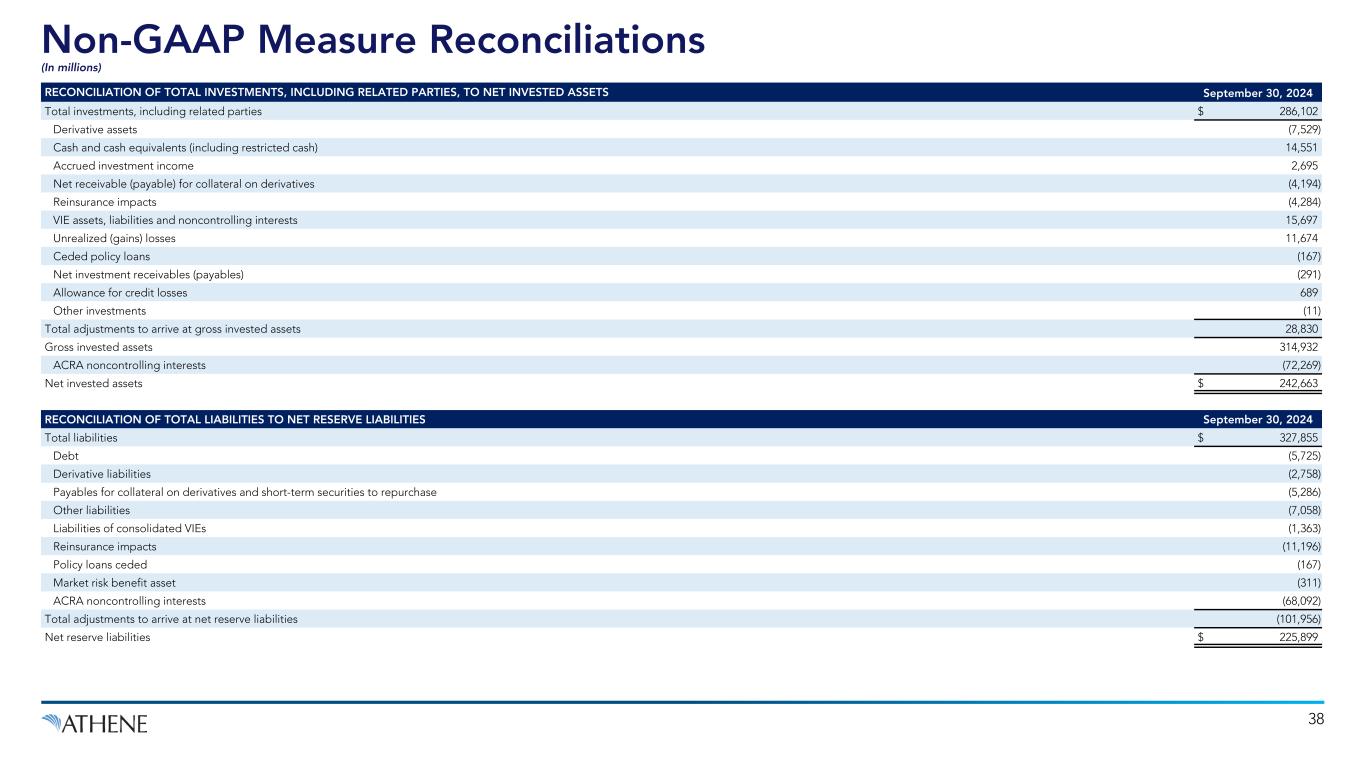 Non-GAAP Measure Reconciliations (In millions) 37 RECONCILIATION OF NET INCOME (LOSS) AVAILABLE TO AHL COMMON STOCKHOLDER TO SPREAD RELATED EARNINGS, EXCLUDING NOTABLE ITEMS Year ended December 31 Twelve months ended September 30, 2024 Nine months ended September 30, 20242019 2020 2021 2022 2023 Net income (loss) available to Athene Holding Ltd. common stockholder $ 2,136 $ 1,446 $ 3,718 $ (3,051) $ 4,484 $ 5,235 $ 2,310 Preferred stock dividends 36 95 141 141 181 181 136 Net income (loss) attributable to noncontrolling interests 13 380 (59) (2,106) 1,087 2,112 1,379 Net income (loss) 2,185 1,921 3,800 (5,016) 5,752 7,528 3,825 Income tax expense (benefit) 117 285 386 (646) (1,161) (960) 659 Income (loss) before income taxes 2,302 2,206 4,186 (5,662) 4,591 6,568 4,484 Investment gains (losses), net of offsets 994 733 1,024 (7,434) 170 1,481 482 Non-operating change in insurance liabilities and related derivatives, net of offsets1 (65) (235) 692 1,433 182 (55) 363 Integration, restructuring and other non-operating expenses (70) (10) (124) (133) (130) (297) (265) Stock compensation expense (27) (25) (38) (56) (88) (82) (36) Preferred stock dividends 36 95 141 141 181 181 136 Noncontrolling interests - pre-tax income (loss) and VIE adjustments 13 393 (18) (2,079) 1,169 2,208 1,421 Less: Total adjustments to income (loss) before income taxes 881 951 1,677 (8,128) 1,484 3,436 2,101 Spread related earnings 1,421 1,255 2,509 2,466 3,107 3,132 2,383 Notable items 5 (40) (52) 3 (115) (25) (25) Spread related earnings, excluding notable items $ 1,426 $ 1,215 $ 2,457 $ 2,469 $ 2,992 $ 3,107 $ 2,358 RECONCILIATION OF BENEFITS AND EXPENSES TO COST OF FUNDS Three months ended September 30, 2024 US GAAP benefits and expenses $ 4,847 8.15 % Premiums (389) (0.65) % Product charges (267) (0.45) % Other revenues (4) (0.01) % FIA option costs 410 0.69 % Reinsurance impacts (47) (0.08) % Non-operating change in insurance liabilities and embedded derivatives (1,252) (2.11) % Policy and other operating expenses, excluding policy acquisition expenses (573) (0.96) % Forward points adjustment on FX derivative hedges 77 0.13 % AmerUs Closed Block fair value liability (55) (0.09) % ACRA noncontrolling interests (833) (1.40) % Other 69 0.12 % Total adjustments to arrive at cost of funds (2,864) (4.81) % Total cost of funds $ 1,983 3.34 % Average net invested assets $ 237,810 1 Prior to the adoption of LDTI, effective January 1, 2023, with a retrospective application back to January 1, 2022, offsets related to deferred acquisition costs, deferred sales inducements, value of business acquired and rider reserves.