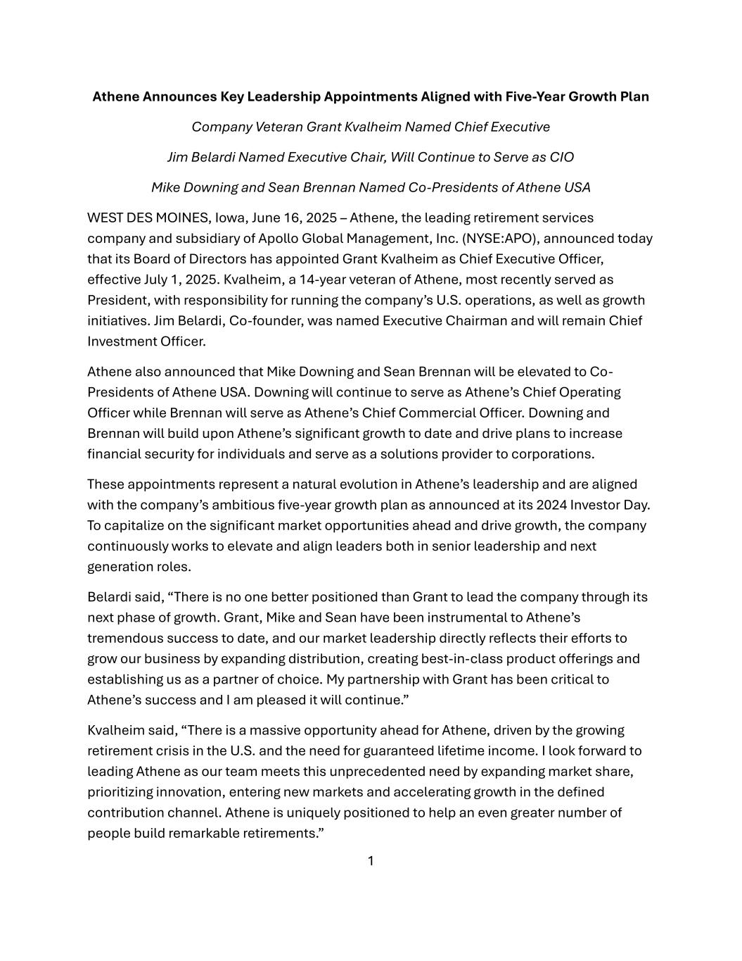 1 Athene Announces Key Leadership Appointments Aligned with Five-Year Growth Plan Company Veteran Grant Kvalheim Named Chief Executive Jim Belardi Named Executive Chair, Will Continue to Serve as CIO Mike Downing and Sean Brennan Named Co-Presidents of Athene USA WEST DES MOINES, Iowa, June 16, 2025 – Athene, the leading retirement services company and subsidiary of Apollo Global Management, Inc. (NYSE:APO), announced today that its Board of Directors has appointed Grant Kvalheim as Chief Executive Officer, effective July 1, 2025. Kvalheim, a 14-year veteran of Athene, most recently served as President, with responsibility for running the company’s U.S. operations, as well as growth initiatives. Jim Belardi, Co-founder, was named Executive Chairman and will remain Chief Investment Officer. Athene also announced that Mike Downing and Sean Brennan will be elevated to Co- Presidents of Athene USA. Downing will continue to serve as Athene’s Chief Operating Officer while Brennan will serve as Athene’s Chief Commercial Officer. Downing and Brennan will build upon Athene’s significant growth to date and drive plans to increase financial security for individuals and serve as a solutions provider to corporations. These appointments represent a natural evolution in Athene’s leadership and are aligned with the company’s ambitious five-year growth plan as announced at its 2024 Investor Day. To capitalize on the significant market opportunities ahead and drive growth, the company continuously works to elevate and align leaders both in senior leadership and next generation roles. Belardi said, “There is no one better positioned than Grant to lead the company through its next phase of growth. Grant, Mike and Sean have been instrumental to Athene’s tremendous success to date, and our market leadership directly reflects their efforts to grow our business by expanding distribution, creating best-in-class product offerings and establishing us as a partner of choice. My partnership with Grant has been critical to Athene’s success and I am pleased it will continue.” Kvalheim said, “There is a massive opportunity ahead for Athene, driven by the growing retirement crisis in the U.S. and the need for guaranteed lifetime income. I look forward to leading Athene as our team meets this unprecedented need by expanding market share, prioritizing innovation, entering new markets and accelerating growth in the defined contribution channel. Athene is uniquely positioned to help an even greater number of people build remarkable retirements.”