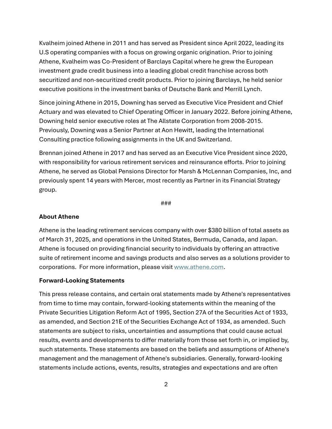 2 Kvalheim joined Athene in 2011 and has served as President since April 2022, leading its U.S operating companies with a focus on growing organic origination. Prior to joining Athene, Kvalheim was Co-President of Barclays Capital where he grew the European investment grade credit business into a leading global credit franchise across both securitized and non-securitized credit products. Prior to joining Barclays, he held senior executive positions in the investment banks of Deutsche Bank and Merrill Lynch. Since joining Athene in 2015, Downing has served as Executive Vice President and Chief Actuary and was elevated to Chief Operating Officer in January 2022. Before joining Athene, Downing held senior executive roles at The Allstate Corporation from 2008-2015. Previously, Downing was a Senior Partner at Aon Hewitt, leading the International Consulting practice following assignments in the UK and Switzerland. Brennan joined Athene in 2017 and has served as an Executive Vice President since 2020, with responsibility for various retirement services and reinsurance efforts. Prior to joining Athene, he served as Global Pensions Director for Marsh & McLennan Companies, Inc, and previously spent 14 years with Mercer, most recently as Partner in its Financial Strategy group. ### About Athene Athene is the leading retirement services company with over $380 billion of total assets as of March 31, 2025, and operations in the United States, Bermuda, Canada, and Japan. Athene is focused on providing financial security to individuals by offering an attractive suite of retirement income and savings products and also serves as a solutions provider to corporations. For more information, please visit www.athene.com. Forward-Looking Statements This press release contains, and certain oral statements made by Athene's representatives from time to time may contain, forward-looking statements within the meaning of the Private Securities Litigation Reform Act of 1995, Section 27A of the Securities Act of 1933, as amended, and Section 21E of the Securities Exchange Act of 1934, as amended. Such statements are subject to risks, uncertainties and assumptions that could cause actual results, events and developments to differ materially from those set forth in, or implied by, such statements. These statements are based on the beliefs and assumptions of Athene's management and the management of Athene's subsidiaries. Generally, forward-looking statements include actions, events, results, strategies and expectations and are often