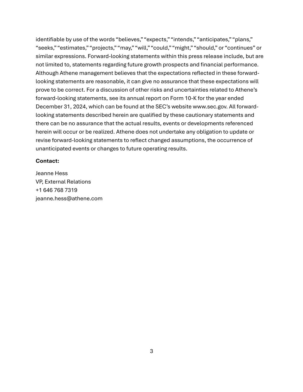 3 identifiable by use of the words “believes,” “expects,” “intends,” “anticipates,” “plans,” “seeks,” “estimates,” “projects,” “may,” “will,” “could,” “might,” “should,” or “continues” or similar expressions. Forward-looking statements within this press release include, but are not limited to, statements regarding future growth prospects and financial performance. Although Athene management believes that the expectations reflected in these forward- looking statements are reasonable, it can give no assurance that these expectations will prove to be correct. For a discussion of other risks and uncertainties related to Athene’s forward-looking statements, see its annual report on Form 10-K for the year ended December 31, 2024, which can be found at the SEC’s website www.sec.gov. All forward- looking statements described herein are qualified by these cautionary statements and there can be no assurance that the actual results, events or developments referenced herein will occur or be realized. Athene does not undertake any obligation to update or revise forward-looking statements to reflect changed assumptions, the occurrence of unanticipated events or changes to future operating results. Contact: Jeanne Hess VP, External Relations +1 646 768 7319 jeanne.hess@athene.com