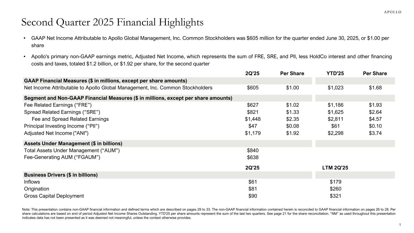 2Q'25 Per Share YTD'25 Per Share GAAP Financial Measures ($ in millions, except per share amounts) Net Income Attributable to Apollo Global Management, Inc. Common Stockholders $605 $1.00 $1,023 $1.68 Segment and Non-GAAP Financial Measures ($ in millions, except per share amounts) Fee Related Earnings (“FRE”) $627 $1.02 $1,186 $1.93 Spread Related Earnings (“SRE”) $821 $1.33 $1,625 $2.64 Fee and Spread Related Earnings $1,448 $2.35 $2,811 $4.57 Principal Investing Income (“PII”) $47 $0.08 $61 $0.10 Adjusted Net Income ("ANI") $1,179 $1.92 $2,298 $3.74 Assets Under Management ($ in billions) Total Assets Under Management (“AUM”) $840 Fee-Generating AUM (“FGAUM”) $638 2Q'25 LTM 2Q'25 Business Drivers ($ in billions) Inflows $61 $179 Origination $81 $260 Gross Capital Deployment $90 $321 Second Quarter 2025 Financial Highlights • GAAP Net Income Attributable to Apollo Global Management, Inc. Common Stockholders was $605 million for the quarter ended June 30, 2025, or $1.00 per share • Apollo's primary non-GAAP earnings metric, Adjusted Net Income, which represents the sum of FRE, SRE, and PII, less HoldCo interest and other financing costs and taxes, totaled $1.2 billion, or $1.92 per share, for the second quarter Note: This presentation contains non-GAAP financial information and defined terms which are described on pages 29 to 33. The non-GAAP financial information contained herein is reconciled to GAAP financial information on pages 26 to 28. Per share calculations are based on end of period Adjusted Net Income Shares Outstanding. YTD'25 per share amounts represent the sum of the last two quarters. See page 21 for the share reconciliation. “NM” as used throughout this presentation indicates data has not been presented as it was deemed not meaningful, unless the context otherwise provides. 1