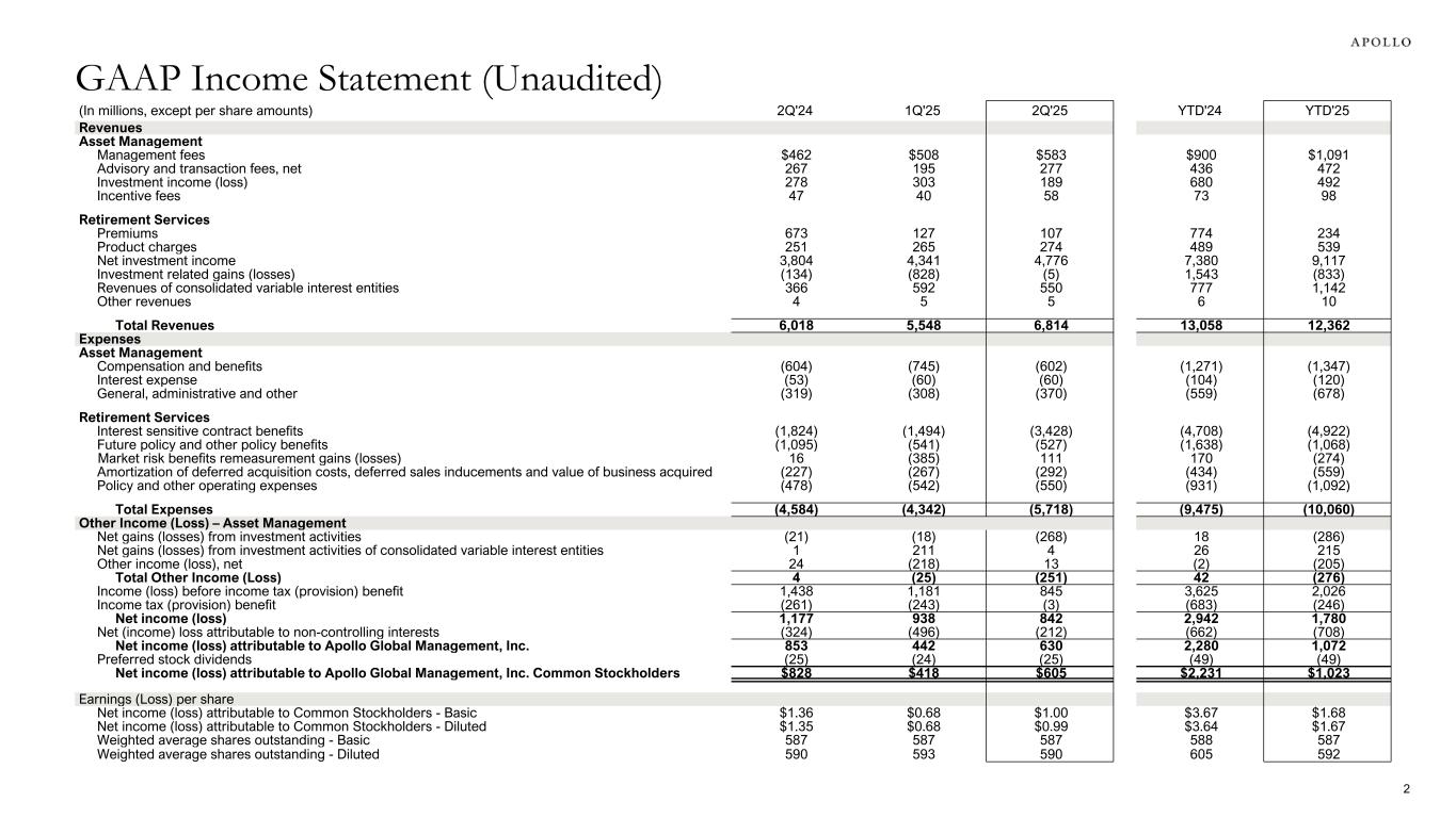 (In millions, except per share amounts) 2Q'24 1Q'25 2Q'25 YTD'24 YTD'25 Revenues     Asset Management     Management fees $462 $508 $583 $900 $1,091 Advisory and transaction fees, net 267 195 277 436 472 Investment income (loss) 278 303 189 680 492 Incentive fees 47 40 58 73 98   Retirement Services     Premiums 673 127 107 774 234 Product charges 251 265 274 489 539 Net investment income 3,804 4,341 4,776 7,380 9,117 Investment related gains (losses) (134) (828) (5) 1,543 (833) Revenues of consolidated variable interest entities 366 592 550 777 1,142 Other revenues 4 5 5 6 10   Total Revenues 6,018 5,548 6,814 13,058 12,362 Expenses Asset Management     Compensation and benefits (604) (745) (602) (1,271) (1,347) Interest expense (53) (60) (60) (104) (120) General, administrative and other (319) (308) (370) (559) (678)   Retirement Services     Interest sensitive contract benefits (1,824) (1,494) (3,428) (4,708) (4,922) Future policy and other policy benefits (1,095) (541) (527) (1,638) (1,068) Market risk benefits remeasurement gains (losses) 16 (385) 111 170 (274) Amortization of deferred acquisition costs, deferred sales inducements and value of business acquired (227) (267) (292) (434) (559) Policy and other operating expenses (478) (542) (550) (931) (1,092)   Total Expenses (4,584) (4,342) (5,718) (9,475) (10,060) Other Income (Loss) – Asset Management Net gains (losses) from investment activities (21) (18) (268) 18 (286) Net gains (losses) from investment activities of consolidated variable interest entities 1 211 4 26 215 Other income (loss), net 24 (218) 13 (2) (205) Total Other Income (Loss) 4 (25) (251) 42 (276) Income (loss) before income tax (provision) benefit 1,438 1,181 845 3,625 2,026 Income tax (provision) benefit (261) (243) (3) (683) (246) Net income (loss) 1,177 938 842 2,942 1,780 Net (income) loss attributable to non-controlling interests (324) (496) (212) (662) (708) Net income (loss) attributable to Apollo Global Management, Inc. 853 442 630 2,280 1,072 Preferred stock dividends (25) (24) (25) (49) (49) Net income (loss) attributable to Apollo Global Management, Inc. Common Stockholders $828 $418 $605 $2,231 $1,023       Earnings (Loss) per share Net income (loss) attributable to Common Stockholders - Basic $1.36 $0.68 $1.00 $3.67 $1.68 Net income (loss) attributable to Common Stockholders - Diluted $1.35 $0.68 $0.99 $3.64 $1.67 Weighted average shares outstanding - Basic 587 587 587 588 587 Weighted average shares outstanding - Diluted 590 593 590 605 592 GAAP Income Statement (Unaudited) 2