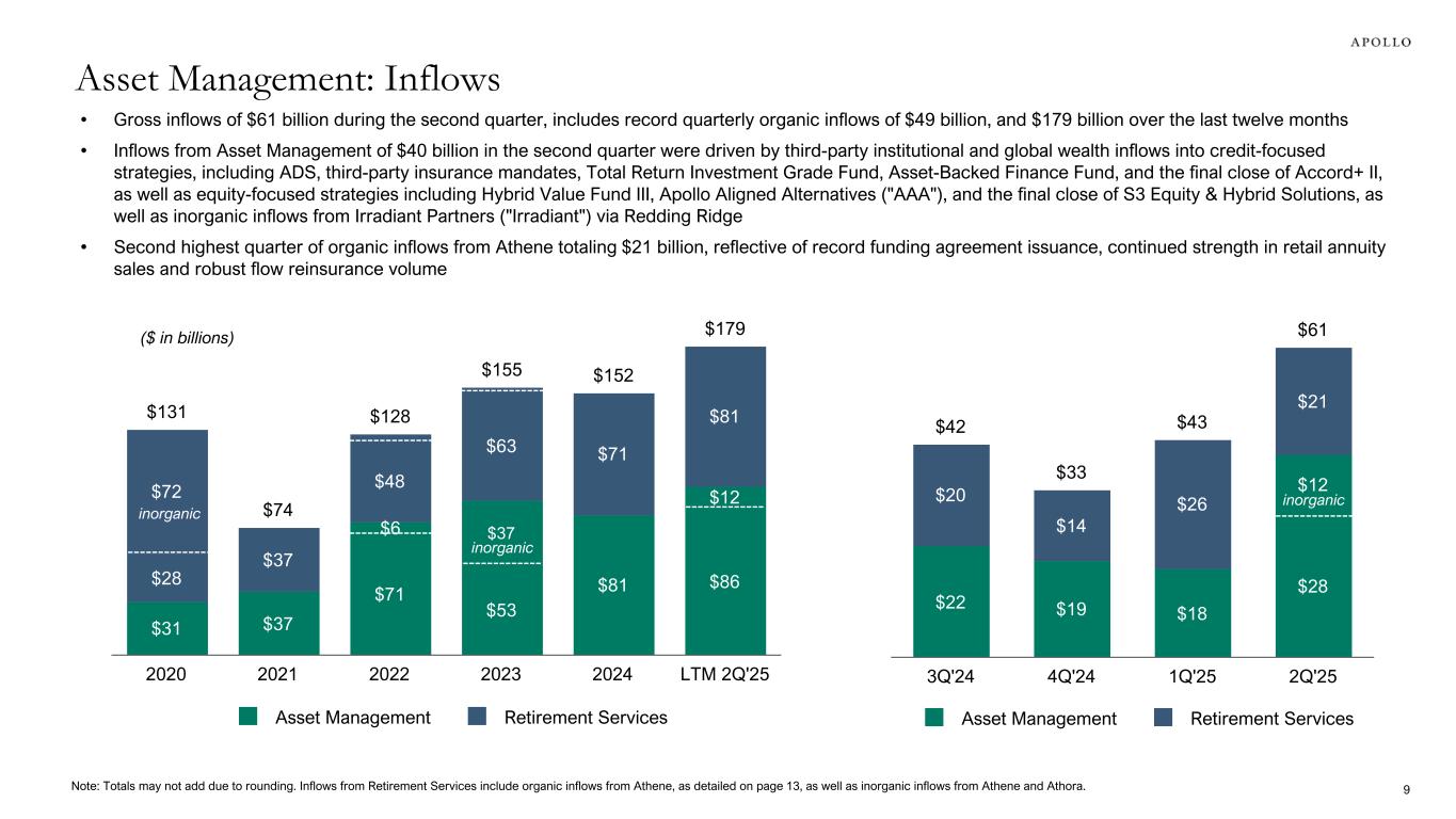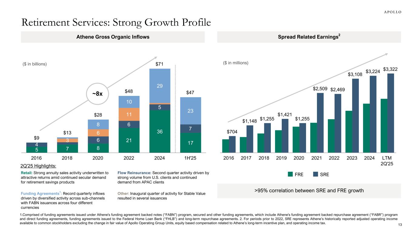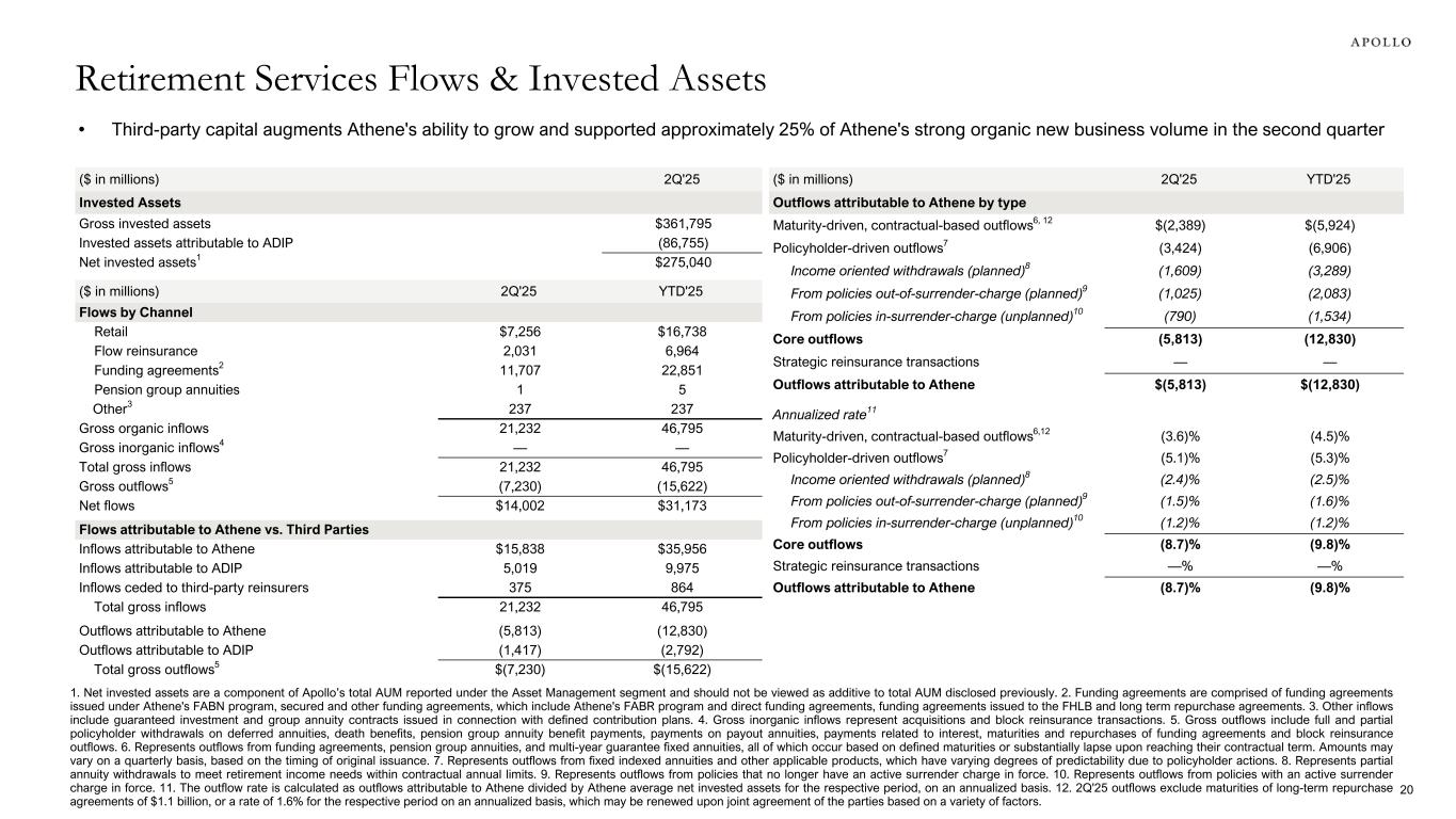 • Third-party capital augments Athene's ability to grow and supported approximately 25% of Athene's strong organic new business volume in the second quarter 20 1. Net invested assets are a component of Apollo’s total AUM reported under the Asset Management segment and should not be viewed as additive to total AUM disclosed previously. 2. Funding agreements are comprised of funding agreements issued under Athene's FABN program, secured and other funding agreements, which include Athene's FABR program and direct funding agreements, funding agreements issued to the FHLB and long term repurchase agreements. 3. Other inflows include guaranteed investment and group annuity contracts issued in connection with defined contribution plans. 4. Gross inorganic inflows represent acquisitions and block reinsurance transactions. 5. Gross outflows include full and partial policyholder withdrawals on deferred annuities, death benefits, pension group annuity benefit payments, payments on payout annuities, payments related to interest, maturities and repurchases of funding agreements and block reinsurance outflows. 6. Represents outflows from funding agreements, pension group annuities, and multi-year guarantee fixed annuities, all of which occur based on defined maturities or substantially lapse upon reaching their contractual term. Amounts may vary on a quarterly basis, based on the timing of original issuance. 7. Represents outflows from fixed indexed annuities and other applicable products, which have varying degrees of predictability due to policyholder actions. 8. Represents partial annuity withdrawals to meet retirement income needs within contractual annual limits. 9. Represents outflows from policies that no longer have an active surrender charge in force. 10. Represents outflows from policies with an active surrender charge in force. 11. The outflow rate is calculated as outflows attributable to Athene divided by Athene average net invested assets for the respective period, on an annualized basis. 12. 2Q'25 outflows exclude maturities of long-term repurchase agreements of $1.1 billion, or a rate of 1.6% for the respective period on an annualized basis, which may be renewed upon joint agreement of the parties based on a variety of factors. Retirement Services Flows & Invested Assets ($ in millions) 2Q'25 YTD'25 Flows by Channel Retail $7,256 $16,738 Flow reinsurance 2,031 6,964 Funding agreements2 11,707 22,851 Pension group annuities 1 5 Other3 237 237 Gross organic inflows 21,232 46,795 Gross inorganic inflows4 — — Total gross inflows 21,232 46,795 Gross outflows5 (7,230) (15,622) Net flows $14,002 $31,173 Flows attributable to Athene vs. Third Parties Inflows attributable to Athene $15,838 $35,956 Inflows attributable to ADIP 5,019 9,975 Inflows ceded to third-party reinsurers 375 864 Total gross inflows 21,232 46,795 Outflows attributable to Athene (5,813) (12,830) Outflows attributable to ADIP (1,417) (2,792) Total gross outflows5 $(7,230) $(15,622) ($ in millions) 2Q'25 Invested Assets Gross invested assets $361,795 Invested assets attributable to ADIP (86,755) Net invested assets1 $275,040 ($ in millions) 2Q'25 YTD'25 Outflows attributable to Athene by type Maturity-driven, contractual-based outflows6, 12 $(2,389) $(5,924) Policyholder-driven outflows7 (3,424) (6,906) Income oriented withdrawals (planned)8 (1,609) (3,289) From policies out-of-surrender-charge (planned)9 (1,025) (2,083) From policies in-surrender-charge (unplanned)10 (790) (1,534) Core outflows (5,813) (12,830) Strategic reinsurance transactions — — Outflows attributable to Athene $(5,813) $(12,830) Annualized rate11 Maturity-driven, contractual-based outflows6,12 (3.6)% (4.5)% Policyholder-driven outflows7 (5.1)% (5.3)% Income oriented withdrawals (planned)8 (2.4)% (2.5)% From policies out-of-surrender-charge (planned)9 (1.5)% (1.6)% From policies in-surrender-charge (unplanned)10 (1.2)% (1.2)% Core outflows (8.7)% (9.8)% Strategic reinsurance transactions —% —% Outflows attributable to Athene (8.7)% (9.8)%