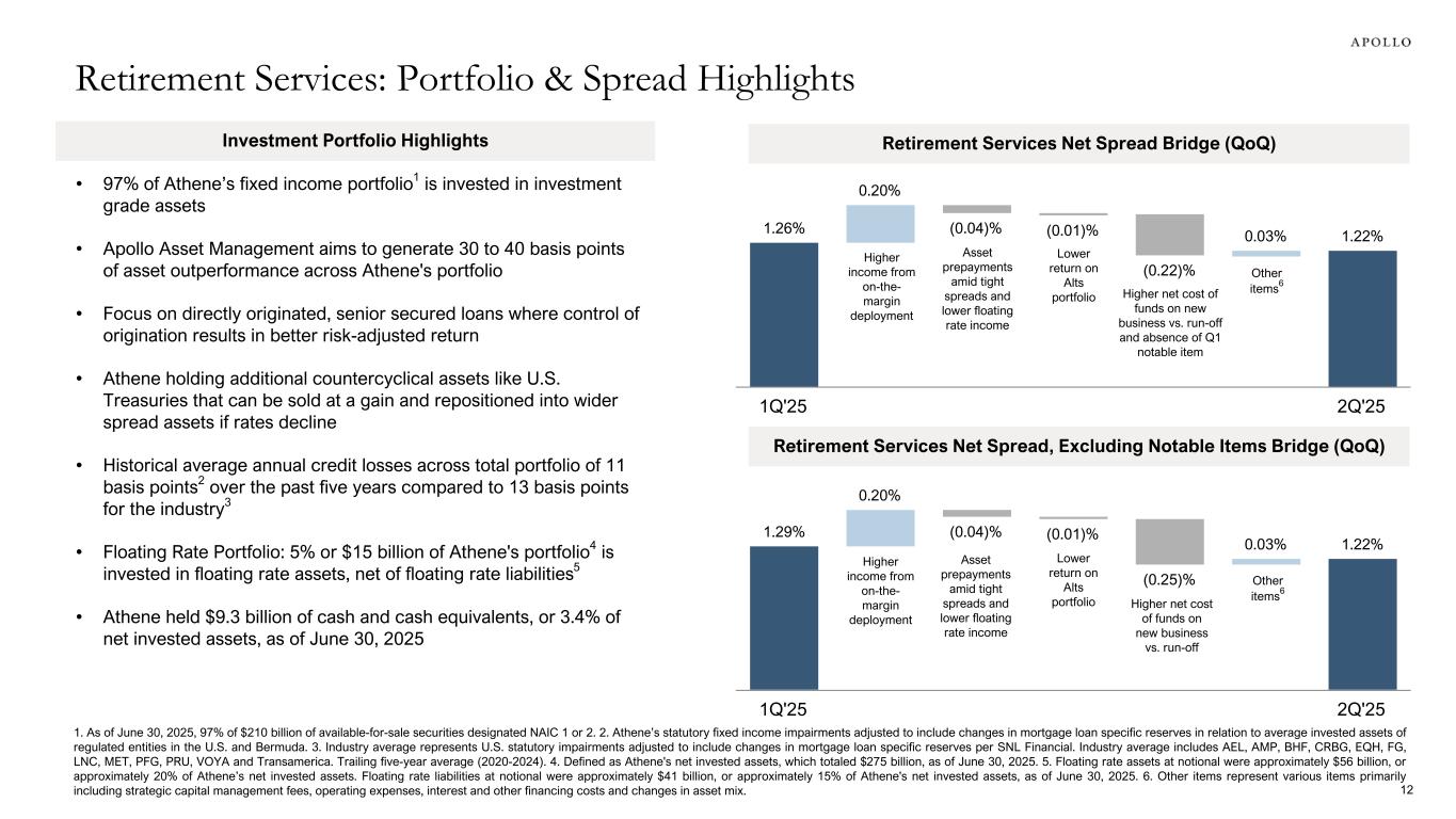 1.26% 0.20% (0.04)% (0.01)% (0.22)% 0.03% 1.22% 1Q'25 2Q'25 Lower return on Alts portfolio Higher net cost of funds on new business vs. run-off and absence of Q1 notable item Investment Portfolio Highlights Retirement Services: Portfolio & Spread Highlights 12 Retirement Services Net Spread Bridge (QoQ) 1. As of June 30, 2025, 97% of $210 billion of available-for-sale securities designated NAIC 1 or 2. 2. Athene’s statutory fixed income impairments adjusted to include changes in mortgage loan specific reserves in relation to average invested assets of regulated entities in the U.S. and Bermuda. 3. Industry average represents U.S. statutory impairments adjusted to include changes in mortgage loan specific reserves per SNL Financial. Industry average includes AEL, AMP, BHF, CRBG, EQH, FG, LNC, MET, PFG, PRU, VOYA and Transamerica. Trailing five-year average (2020-2024). 4. Defined as Athene's net invested assets, which totaled $275 billion, as of June 30, 2025. 5. Floating rate assets at notional were approximately $56 billion, or approximately 20% of Athene’s net invested assets. Floating rate liabilities at notional were approximately $41 billion, or approximately 15% of Athene's net invested assets, as of June 30, 2025. 6. Other items represent various items primarily including strategic capital management fees, operating expenses, interest and other financing costs and changes in asset mix. • 97% of Athene’s fixed income portfolio1 is invested in investment grade assets • Apollo Asset Management aims to generate 30 to 40 basis points of asset outperformance across Athene's portfolio • Focus on directly originated, senior secured loans where control of origination results in better risk-adjusted return • Athene holding additional countercyclical assets like U.S. Treasuries that can be sold at a gain and repositioned into wider spread assets if rates decline • Historical average annual credit losses across total portfolio of 11 basis points2 over the past five years compared to 13 basis points for the industry3 • Floating Rate Portfolio: 5% or $15 billion of Athene's portfolio4 is invested in floating rate assets, net of floating rate liabilities5 • Athene held $9.3 billion of cash and cash equivalents, or 3.4% of net invested assets, as of June 30, 2025 1.29% 0.20% (0.04)% (0.01)% (0.25)% 0.03% 1.22% 1Q'25 2Q'25 Retirement Services Net Spread, Excluding Notable Items Bridge (QoQ) Asset prepayments amid tight spreads and lower floating rate income Other items6 Higher income from on-the- margin deployment Higher income from on-the- margin deployment Lower return on Alts portfolio Higher net cost of funds on new business vs. run-off Other items6 Asset prepayments amid tight spreads and lower floating rate income