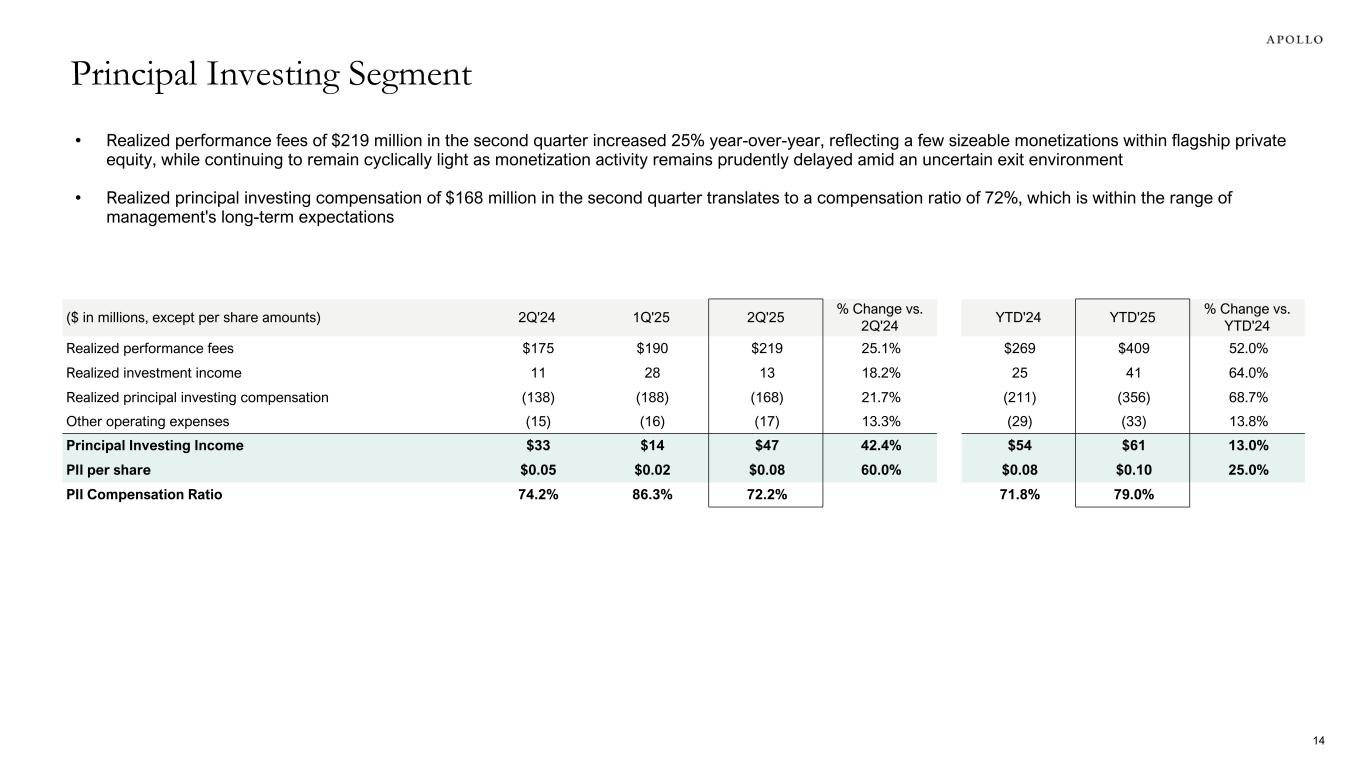 ($ in millions, except per share amounts) 2Q'24 1Q'25 2Q'25 YTD'24 YTD'25 Management fees $672 $770 $816 $1,324 $1,586 Capital solutions fees and other, net 208 154 216 349 370 Fee-related performance fees 52 54 63 98 117 Fee-related compensation (240) (259) (279) (460) (538) Non-compensation expenses (176) (160) (189) (333) (349) Fee Related Earnings $516 $559 $627 $978 $1,186 Net investment spread 945 1,048 1,060 1,967 2,108 Other operating expenses (116) (114) (107) (230) (221) Interest and other financing costs (119) (130) (132) (210) (262) Spread Related Earnings $710 $804 $821 $1,527 $1,625 Fee and Spread Related Earnings $1,226 $1,363 $1,448 $2,505 $2,811 Principal Investing Income $33 $14 $47 $54 $61 Segment Income $1,259 $1,377 $1,495 $2,559 $2,872 HoldCo interest and other financing costs1 (15) (34) (36) (30) (70) Taxes and related payables (235) (224) (280) (456) (504) Adjusted Net Income $1,009 $1,119 $1,179 $2,073 $2,298 ANI per share $1.64 $1.82 $1.92 $3.36 $3.74 1. Represents interest and other financing costs related to Apollo Global Management, Inc. not attributable to any specific segment. Total Segment Earnings 4
