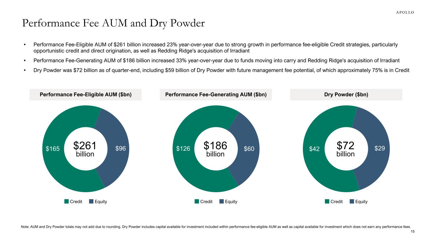 • “Performance Fee-Eligible AUM” or “PFEAUM” refers to the AUM that may eventually produce performance fees. All funds for which we are entitled to receive a performance fee allocation or incentive fee are included in Performance Fee-Eligible AUM, which consists of the following: • “Performance Fee-Generating AUM”, which refers to invested capital of the funds, partnerships and accounts we manage, advise, or to which we provide certain other investment-related services, that is currently above its hurdle rate or preferred return, and profit of such funds, partnerships and accounts is being allocated to, or earned by, the general partner in accordance with the applicable limited partnership agreements or other governing agreements; • “AUM Not Currently Generating Performance Fees”, which refers to invested capital of the funds, partnerships and accounts we manage, advise, or to which we provide certain other investment-related services that is currently below its hurdle rate or preferred return; and • “Uninvested Performance Fee-Eligible AUM”, which refers to capital of the funds, partnerships and accounts we manage, advise, or to which we provide certain other investment-related services that is available for investment or reinvestment subject to the provisions of applicable limited partnership agreements or other governing agreements, which capital is not currently part of the NAV or fair value of investments that may eventually produce performance fees allocable to, or earned by, the general partner. • “ACRA” refers to Athene Co-Invest Reinsurance Affiliate Holding Ltd, together with its subsidiaries (“ACRA 1”), and Athene Co-Invest Reinsurance Affiliate Holding 2 Ltd, together with its subsidiaries (“ACRA 2”). • “ADIP” refers to Apollo/Athene Dedicated Investment Program (“ADIP I”) and Apollo/Athene Dedicated Investment Program II (“ADIP II”), funds managed by Apollo including third-party capital that, through ACRA, invest alongside Athene in certain investments. • “Adjusted Net Income Shares Outstanding” or “ANI Shares Outstanding” consists of total shares of Common Stock outstanding, RSUs that participate in dividends, and shares of Common Stock assumed to be issuable upon the conversion of the shares of Mandatory Convertible Preferred Stock. • “Appreciation (depreciation)” of flagship private equity and hybrid value funds refers to gain (loss) and income for the periods presented on a total return basis before giving effect to fees and expenses. The performance percentage is determined by dividing (a) the change in the fair value of investments over the period presented, minus the change in invested capital over the period presented, plus the realized value for the period presented, by (b) the beginning unrealized value for the period presented plus the change in invested capital for the period presented. Returns over multiple periods are calculated by geometrically linking each period’s return over time. • “Athene” refers to Athene Holding Ltd. (together with its subsidiaries, “Athene”), a subsidiary of the Company and a leading retirement services company that issues, reinsures and acquires retirement savings products designed for the increasing number of individuals and institutions seeking to fund retirement needs, and to which Apollo, through its consolidated subsidiary Apollo Insurance Solutions Group LP (“ISG”), provides asset management and advisory services. • “Athora” refers to a strategic platform that acquires or reinsures blocks of insurance business in the German and broader European life insurance market (collectively, the “Athora Accounts”). • “Capital solutions fees and other, net” primarily includes transaction fees earned by Apollo Capital Solutions (“ACS”) related to underwriting, structuring, arrangement and placement of debt and equity securities, and syndication for funds managed by Apollo, portfolio companies of funds managed by Apollo, and third parties. Capital solutions fees and other, net also includes advisory fees for the ongoing monitoring of portfolio operations and directors' fees. These fees also include certain offsetting amounts including reductions in management fees related to a percentage of these fees recognized (“management fee offset”) and other additional revenue sharing arrangements. • “Cost of Funds” includes liability costs related to cost of crediting on both deferred annuities and institutional products as well as other liability costs, but does not include the proportionate share of the ACRA cost of funds associated with the non-controlling interests. While we believe cost of funds is a meaningful financial metric and enhances the understanding of the underlying profitability drivers of our retirement services business, it should not be used as a substitute for total benefits and expenses presented under U.S. GAAP. • “Dry Powder” represents the amount of capital available for investment or reinvestment subject to the provisions of the applicable limited partnership agreements or other governing agreements of the funds, partnerships and accounts we manage. Dry powder excludes uncalled commitments which can only be called for fund fees and expenses and commitments from perpetual capital vehicles. • “FRE Compensation Ratio” is calculated as fee-related compensation divided by fee-related revenues (which includes management fees, capital solutions fees and other, net, and fee-related performance fees). • “FRE Margin” is calculated as Fee Related Earnings divided by fee-related revenues (which includes management fees, capital solutions fees and other, net, and fee-related performance fees). • “Gross Capital Deployment” represents the gross capital that has been invested by the funds and accounts we manage during the relevant period, but excludes certain investment activities primarily related to he