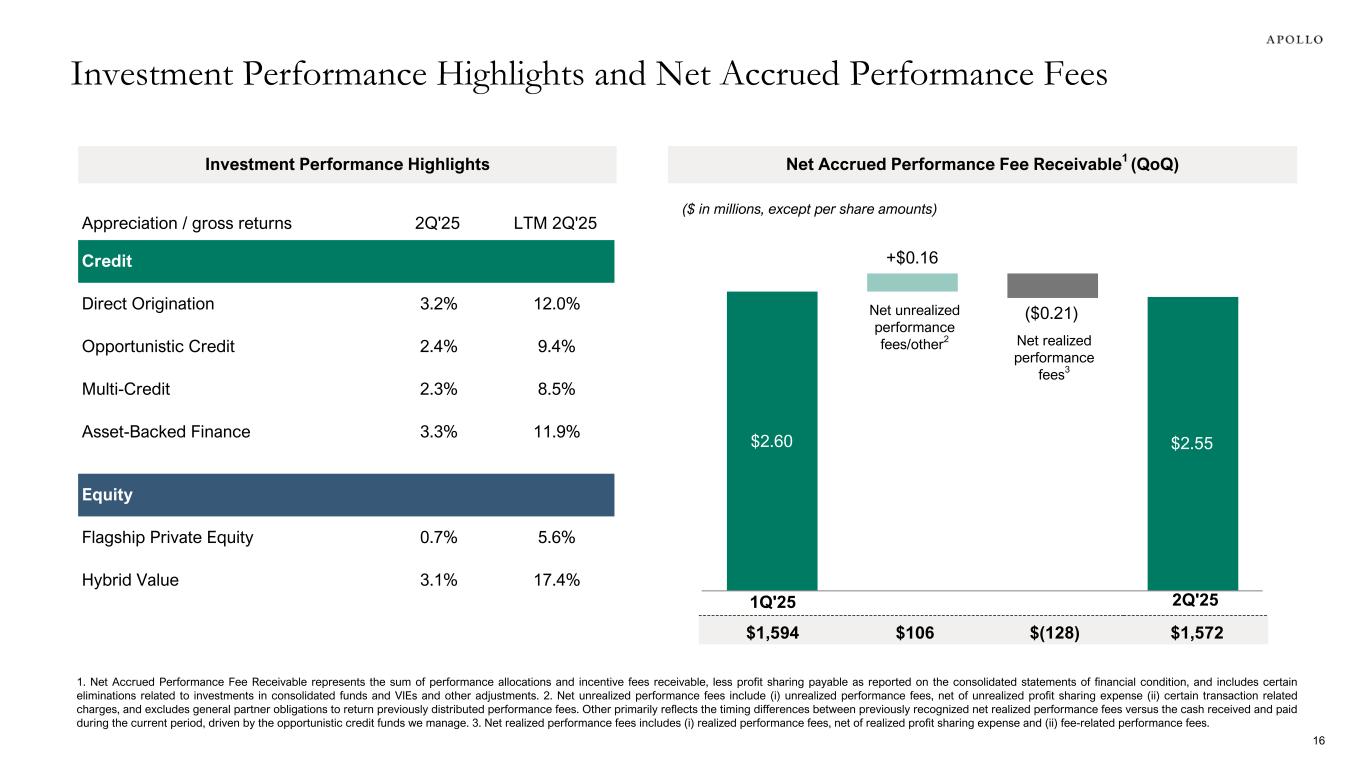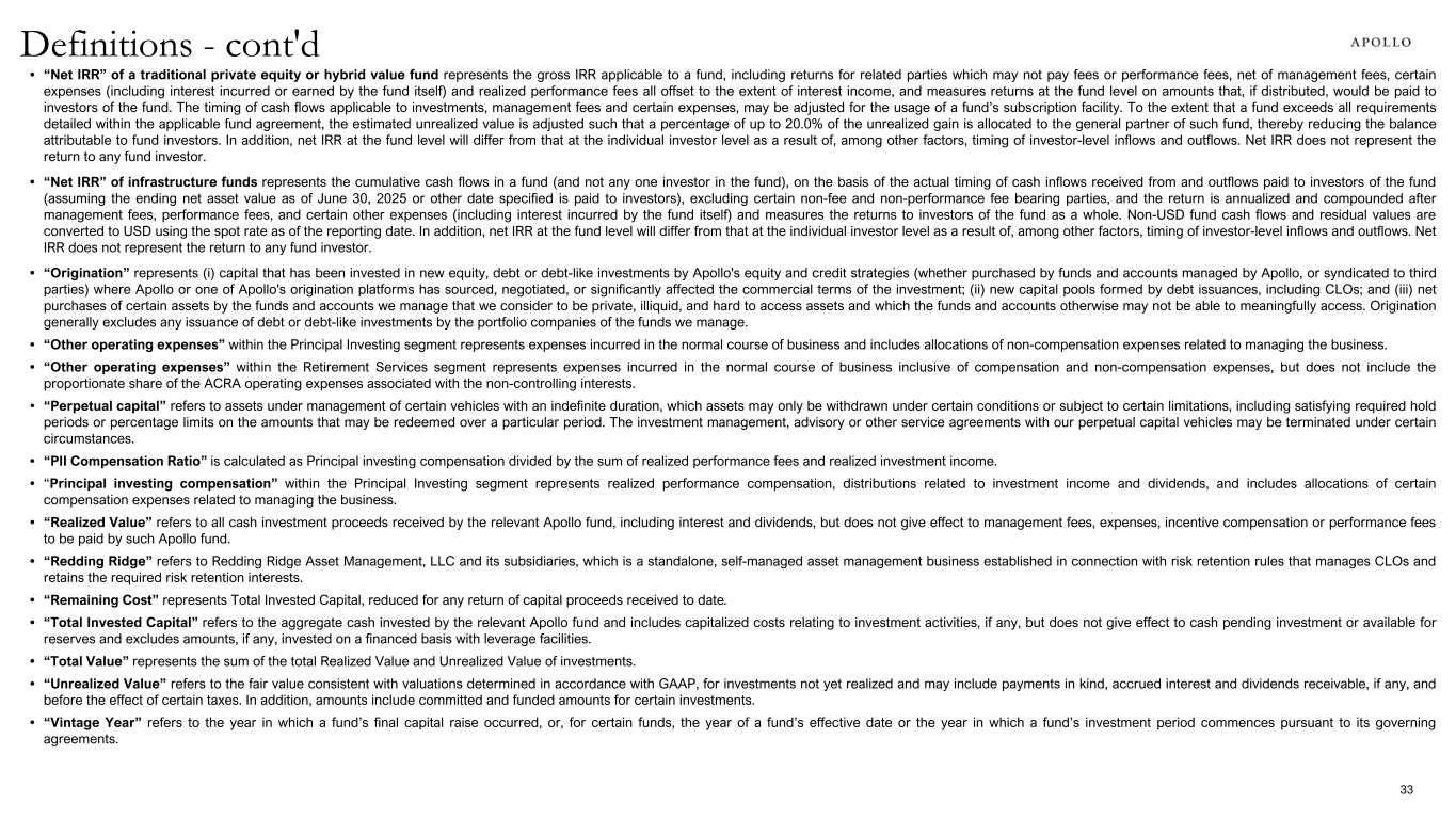 • “Net IRR” of a traditional private equity or hybrid value fund represents the gross IRR applicable to a fund, including returns for related parties which may not pay fees or performance fees, net of management fees, certain expenses (including interest incurred or earned by the fund itself) and realized performance fees all offset to the extent of interest income, and measures returns at the fund level on amounts that, if distributed, would be paid to investors of the fund. The timing of cash flows applicable to investments, management fees and certain expenses, may be adjusted for the usage of a fund’s subscription facility. To the extent that a fund exceeds all requirements detailed within the applicable fund agreement, the estimated unrealized value is adjusted such that a percentage of up to 20.0% of the unrealized gain is allocated to the general partner of such fund, thereby reducing the balance attributable to fund investors. In addition, net IRR at the fund level will differ from that at the individual investor level as a result of, among other factors, timing of investor-level inflows and outflows. Net IRR does not represent the return to any fund investor. • “Net IRR” of infrastructure funds represents the cumulative cash flows in a fund (and not any one investor in the fund), on the basis of the actual timing of cash inflows received from and outflows paid to investors of the fund (assuming the ending net asset value as of June 30, 2025 or other date specified is paid to investors), excluding certain non-fee and non-performance fee bearing parties, and the return is annualized and compounded after management fees, performance fees, and certain other expenses (including interest incurred by the fund itself) and measures the returns to investors of the fund as a whole. Non-USD fund cash flows and residual values are converted to USD using the spot rate as of the reporting date. In addition, net IRR at the fund level will differ from that at the individual investor level as a result of, among other factors, timing of investor-level inflows and outflows. Net IRR does not represent the return to any fund investor. • “Origination” represents (i) capital that has been invested in new equity, debt or debt-like investments by Apollo's equity and credit strategies (whether purchased by funds and accounts managed by Apollo, or syndicated to third parties) where Apollo or one of Apollo's origination platforms has sourced, negotiated, or significantly affected the commercial terms of the investment; (ii) new capital pools formed by debt issuances, including CLOs; and (iii) net purchases of certain assets by the funds and accounts we manage that we consider to be private, illiquid, and hard to access assets and which the funds and accounts otherwise may not be able to meaningfully access. Origination generally excludes any issuance of debt or debt-like investments by the portfolio companies of the funds we manage. • “Other operating expenses” within the Principal Investing segment represents expenses incurred in the normal course of business and includes allocations of non-compensation expenses related to managing the business. • “Other operating expenses” within the Retirement Services segment represents expenses incurred in the normal course of business inclusive of compensation and non-compensation expenses, but does not include the proportionate share of the ACRA operating expenses associated with the non-controlling interests. • “Perpetual capital” refers to assets under management of certain vehicles with an indefinite duration, which assets may only be withdrawn under certain conditions or subject to certain limitations, including satisfying required hold periods or percentage limits on the amounts that may be redeemed over a particular period. The investment management, advisory or other service agreements with our perpetual capital vehicles may be terminated under certain circumstances. • “PII Compensation Ratio” is calculated as Principal investing compensation divided by the sum of realized performance fees and realized investment income. • “Principal investing compensation” within the Principal Investing segment represents realized performance compensation, distributions related to investment income and dividends, and includes allocations of certain compensation expenses related to managing the business. • “Realized Value” refers to all cash investment proceeds received by the relevant Apollo fund, including interest and dividends, but does not give effect to management fees, expenses, incentive compensation or performance fees to be paid by such Apollo fund. • “Redding Ridge” refers to Redding Ridge Asset Management, LLC and its subsidiaries, which is a standalone, self-managed asset management business established in connection with risk retention rules that manages CLOs and retains the required risk retention interests. • “Remaining Cost” represents Total Invested Capital, reduced for any return of capital proceeds received to date. • “Total Invested Capital” refers to the aggregate cash invested by the relevant Apollo fund and includes capitalized costs relating to investment activities, if any, but does not give effect to cash pending investment or available for reserves and excludes amounts, if any, invested on a financed basis with leverage facilities. • “Total Value” represents the sum of the total Realized Value and Unrealized Value of investments. • “Unrealized Value” refers to the fair value consistent with valuations determined in accordance with GAAP, for investments not yet realized and may include payments in kind, accrued interest and dividends receivable, if any, and before the effect of certain taxes. In addition, amounts include committed and funded amounts for certain investments. • “Vintage Year” refers to the year in which a fund’s final capital raise occurred,