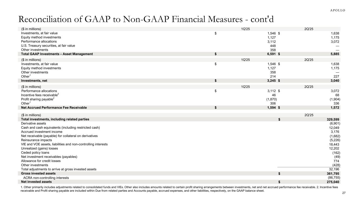 ($ in millions) 2Q'24 3Q'24 4Q'24 1Q'25 2Q'25 YTD'24 YTD'25 GAAP Net income (loss) attributable to Apollo Global Management, Inc. Common Stockholders $828 $787 $1,462 $418 $605 $2,231 $1,023 Preferred dividends 25 24 24 24 25 49 49 Net income (loss) attributable to non-controlling interests 324 958 176 496 212 662 708 GAAP Net income (loss) $1,177 $1,769 $1,662 $938 $842 $2,942 $1,780 Income tax provision (benefit) 261 317 62 243 3 683 246 GAAP Income (loss) before Income tax provision (benefit) $1,438 $2,086 $1,724 $1,181 $845 $3,625 $2,026 Asset Management Adjustments: Equity-based profit sharing expense1 45 41 141 30 38 139 68 Equity-based compensation 84 72 78 99 102 158 201 Net (income) loss attributable to non-controlling interests in consolidated entities (323) (975) (165) (549) (266) (700) (815) Unrealized performance fees (86) 141 (51) (119) 28 (354) (91) Unrealized profit sharing expense 35 (65) 16 105 (43) 194 62 HoldCo interest and other financing costs 15 21 29 34 36 30 70 Unrealized principal investment (income) loss 1 (4) 23 2 (11) (10) (9) Unrealized net (gains) losses from investment activities2 20 (13) (37) 61 293 4 354 Transaction-related costs, restructuring and other non-operating expenses3 67 60 6 276 70 118 346 Retirement Services Adjustments: Investment (gains) losses, net of offsets 124 (628) 265 (151) 509 146 358 Non-operating change in insurance liabilities and related derivatives4 (203) 513 (483) 367 (149) (876) 218 Integration, restructuring and other non-operating expenses 31 204 (26) 30 32 61 62 Equity-based compensation 11 12 14 11 11 24 22 Segment Income $1,259 $1,465 $1,534 $1,377 $1,495 $2,559 $2,872 HoldCo interest and other financing costs (15) (21) (29) (34) (36) (30) (70) Taxes and related payables (235) (312) (145) (224) (280) (456) (504) Adjusted Net Income $1,009 $1,132 $1,360 $1,119 $1,179 $2,073 $2,298 Notable items — (25) — 22 — — 22 Tax impact of notable items — 5 — (5) — — (5) Adjusted Net Income, Excluding Notable Items $1,009 $1,112 $1,360 $1,136 $1,179 $2,073 $2,315 1. Equity-based profit sharing expense includes certain profit sharing arrangements in which a portion of performance fees distributed to the general partner are required to be used by employees of Apollo to purchase restricted shares of common stock or is delivered in the form of RSUs, which are granted under the Equity Plan. Equity-based profit sharing expense and other also includes performance grants which are tied to the Company’s receipt of performance fees, within prescribed periods, sufficient to cover the associated equity-based compensation expense. 2. In 2Q'25, unrealized net (gains) losses from investment activities includes a $257 million impairment related to an equity investment. 3. Transaction- related costs, restructuring and other non-operating expenses includes: a) contingent consideration, certain equity-based charges, amortization of intangible assets and certain other expenses associated with acquisitions; b) gains (losses) from changes in the tax receivable agreement liability; c) merger-related transaction and integration costs associated with Company’s merger with Athene and d) other non-operating expenses, including the issuance of shares of AGM common stock for charitable contributions. In 1Q’25, other non-operating expenses includes $200 million in charitable contributions related to the issuance of shares to a donor-advised fund. 4. Includes change in fair values of derivatives and embedded derivatives, non-operating change in funding agreements, change in fair value of market risk benefits, and non-operating change in liability for future policy benefits. Reconciliation of GAAP to Non-GAAP Financial Measures 26